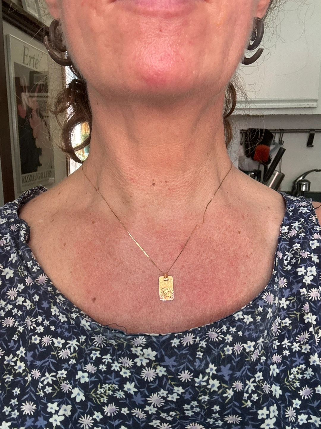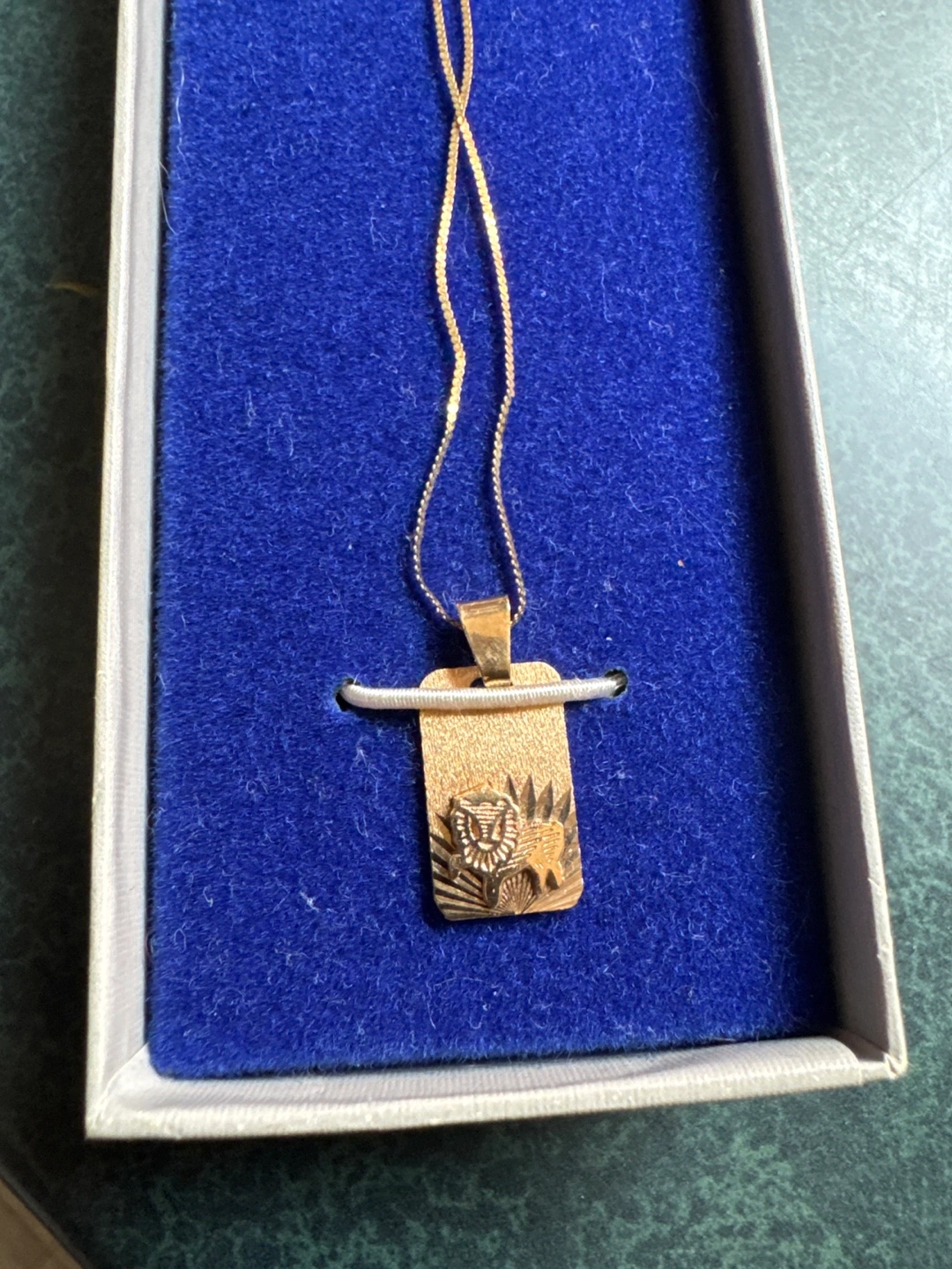 Vintage 10k gold pendant necklace. A delicate chain supports a rectangular pendant, embellished with a Leo symbol.