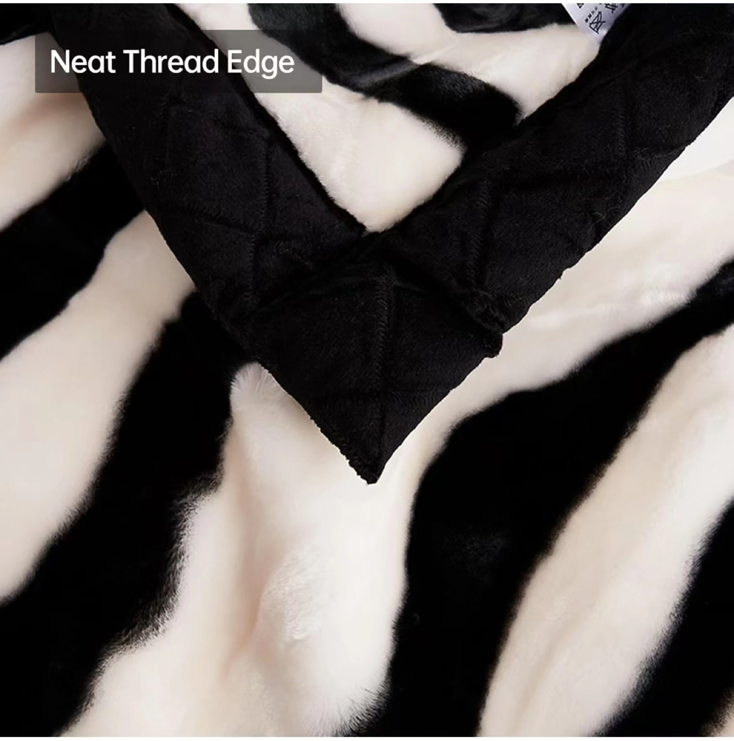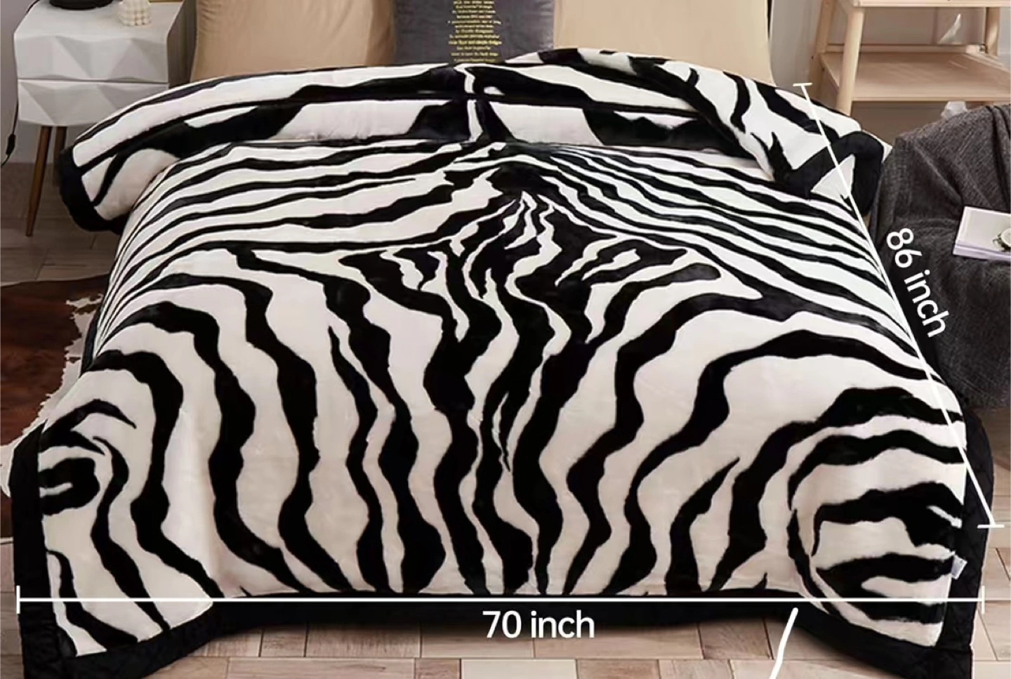 Large, thick and soft plush blanket. Black and white zebra print. Neat thread edge. Measures approximately 70" x 86".