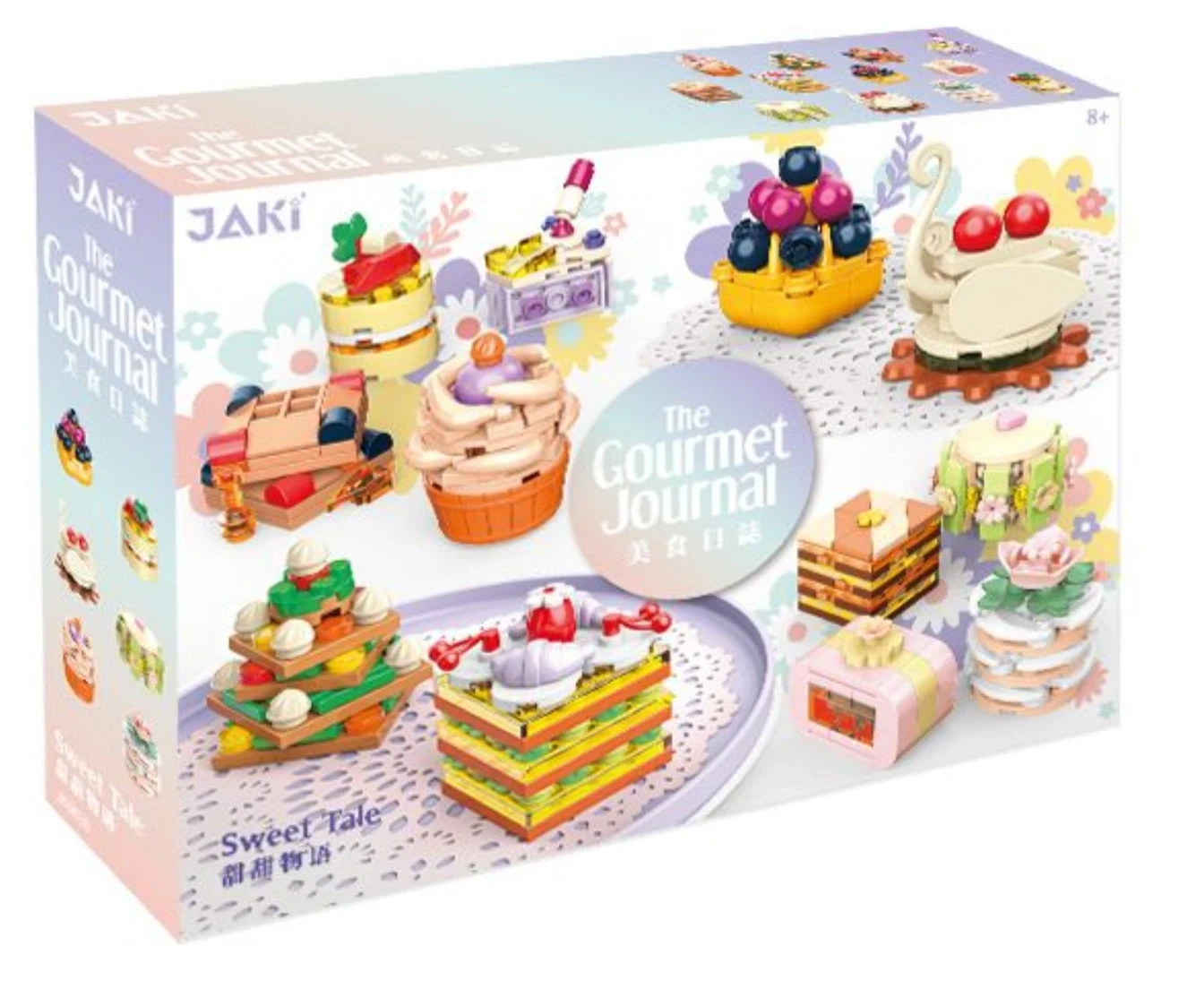 This JAKI building block set features dessert-themed models. It's part of 'The Gourmet Journal' collection. The set includes various small dessert creations.