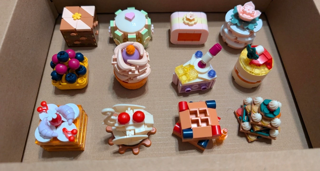 This JAKI building block set features dessert-themed models. It's part of 'The Gourmet Journal' collection. The set includes various small dessert creations.