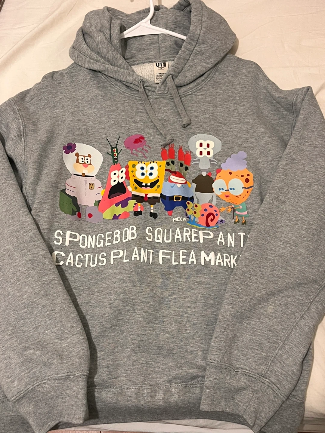 Selling a Uniqlo hoodie featuring a Spongebob Squarepants design! It's a grey hoodie with a fun graphic. Perfect for any Spongebob fan!
