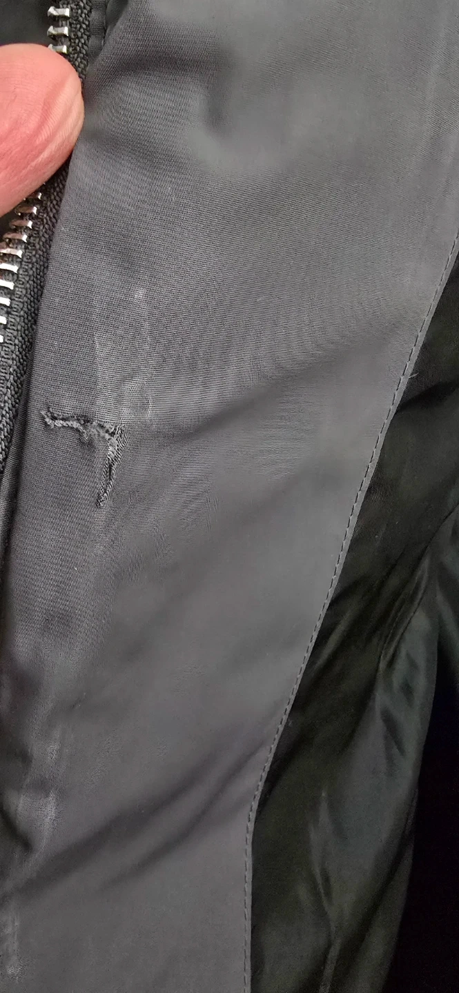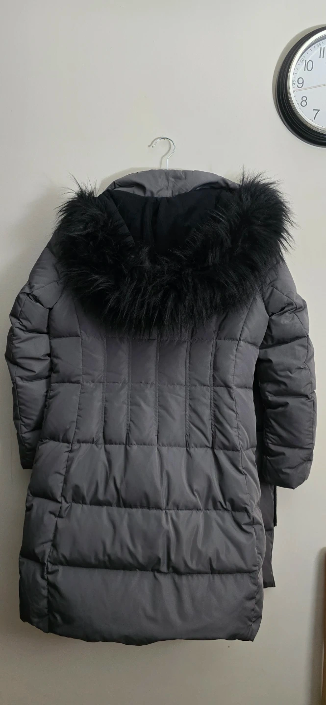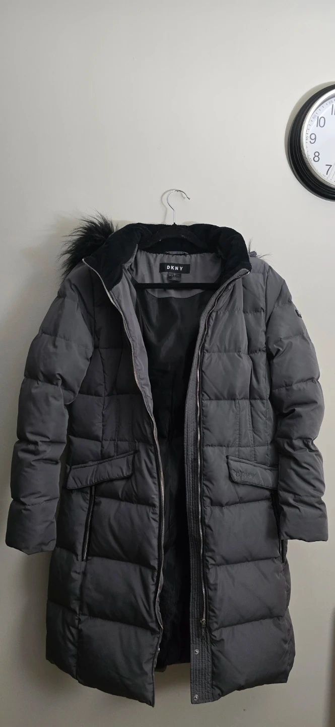 Selling a DKNY grey puffer coat in size M. It has a faux fur hood. There is a small tear on the inside lining.Tag says M and fits L comfortably