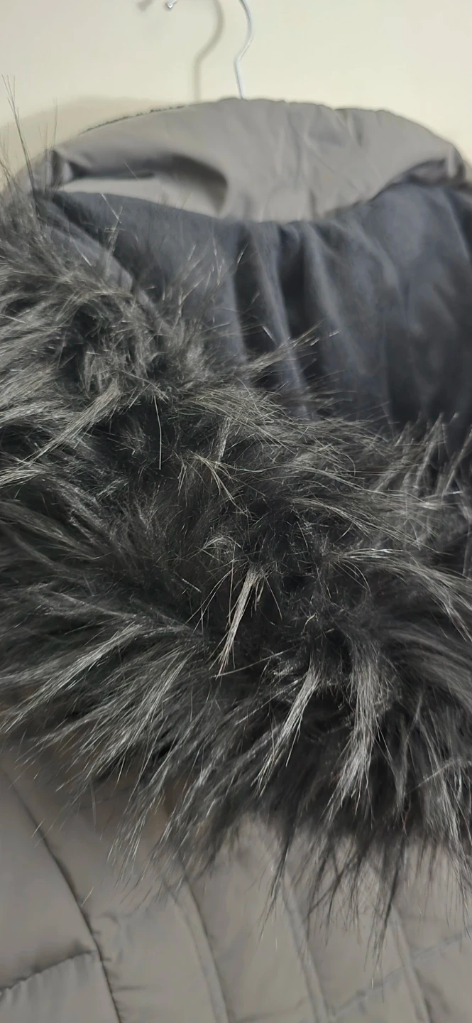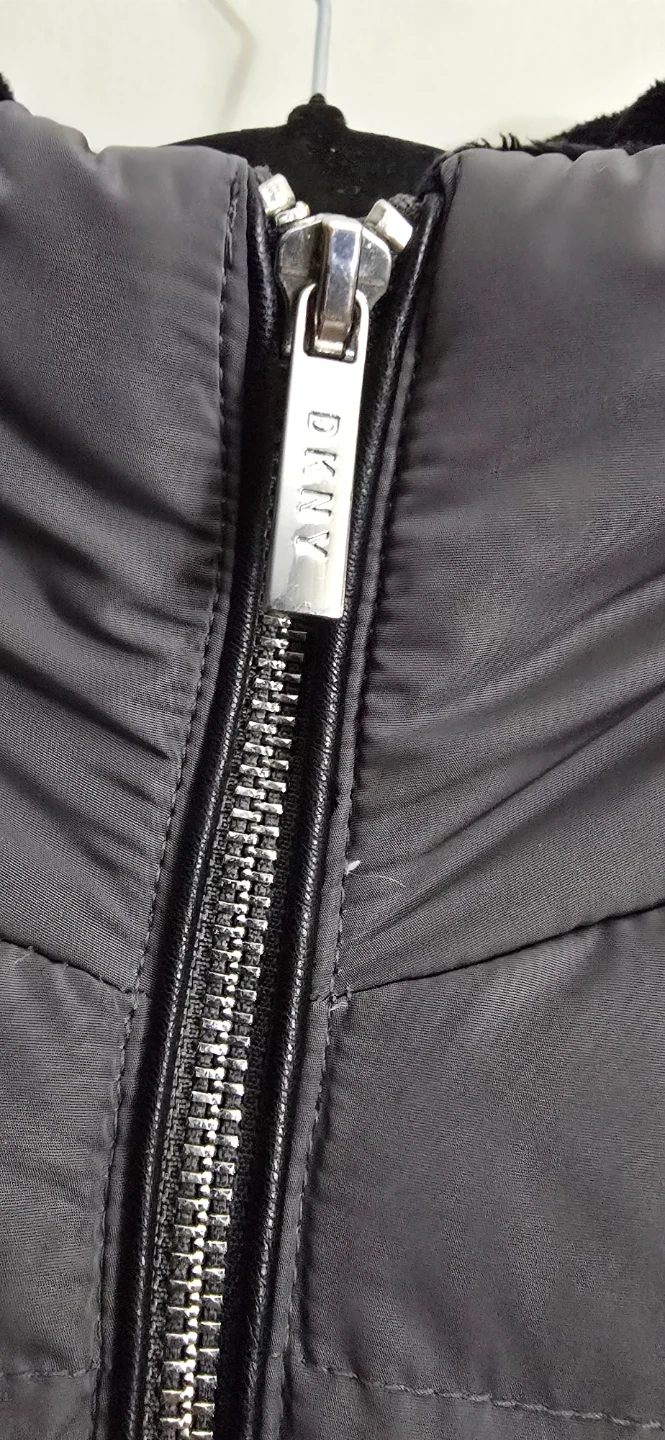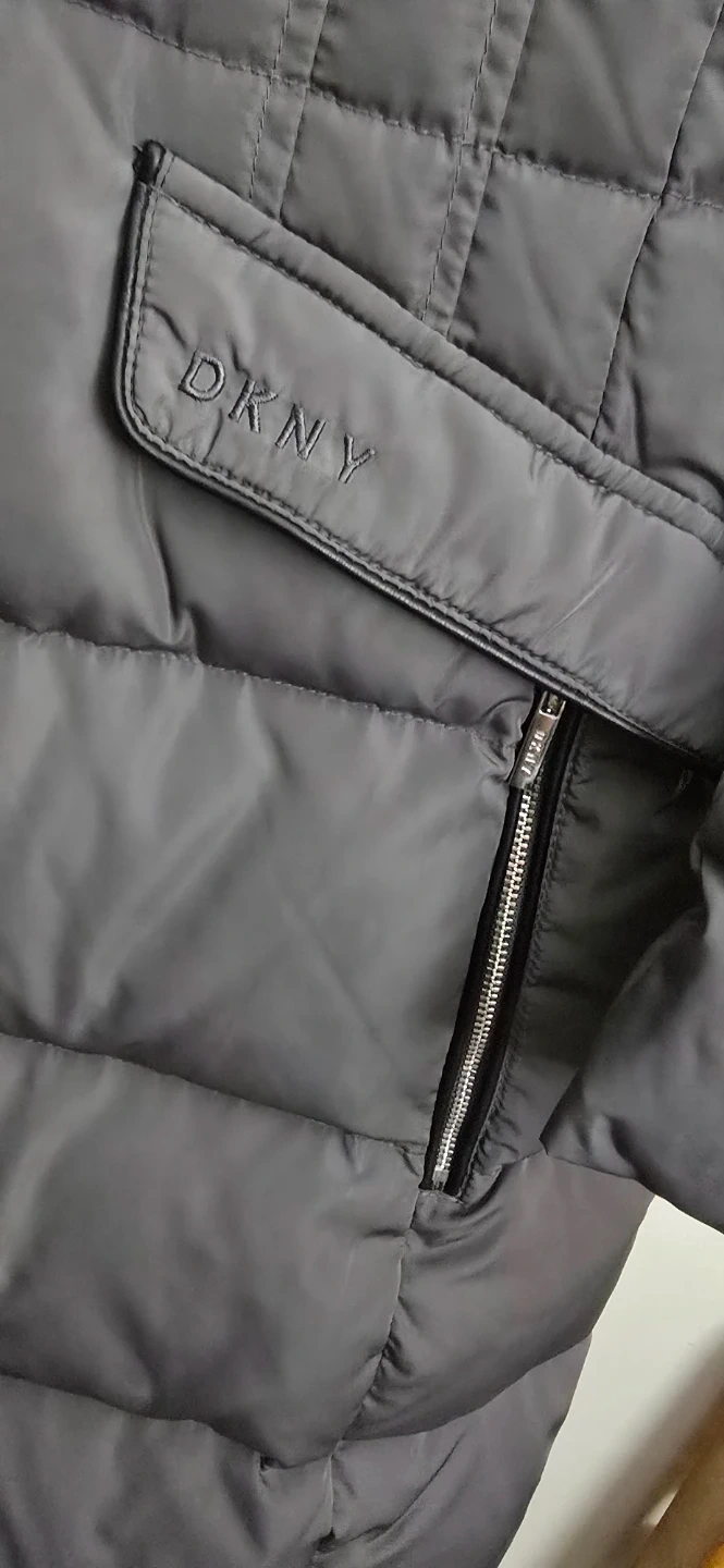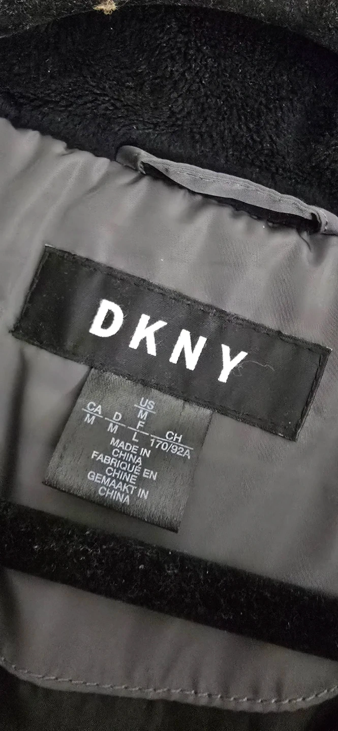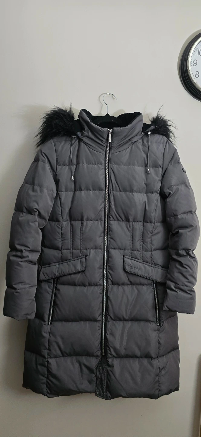 Selling a DKNY grey puffer coat in size M. It has a faux fur hood. There is a small tear on the inside lining.Tag says M and fits L comfortably