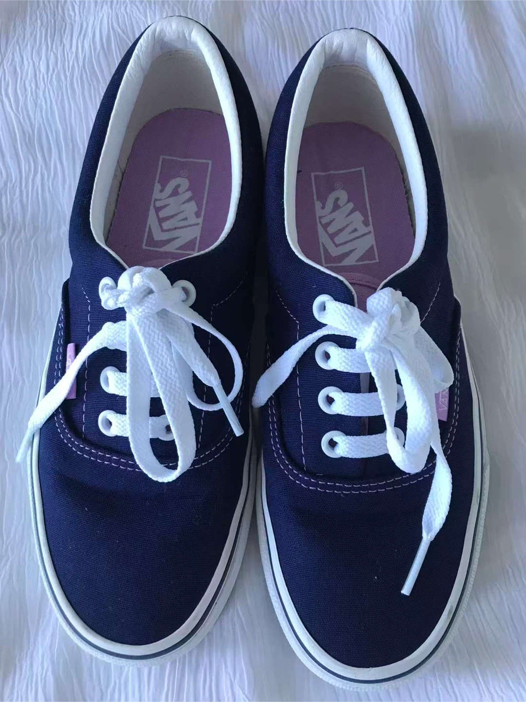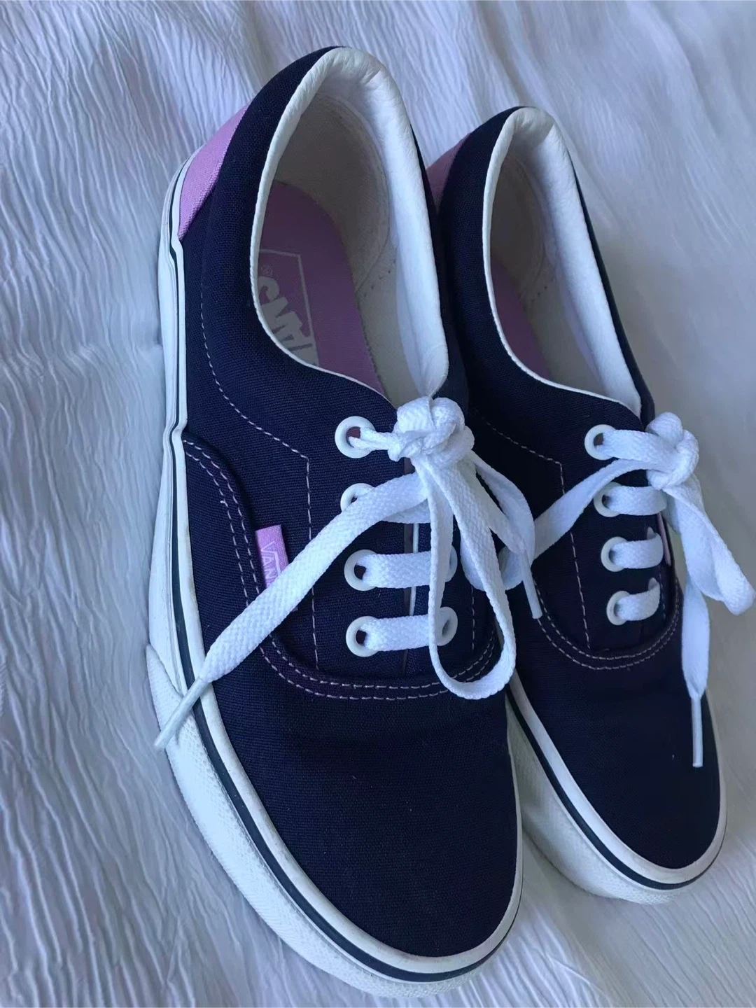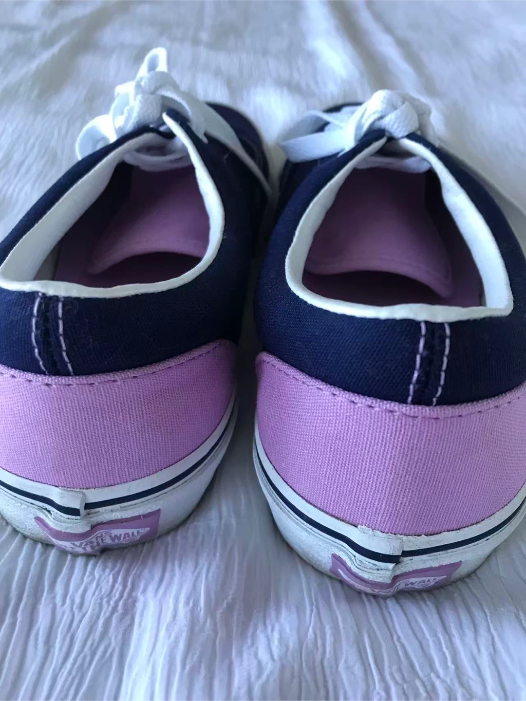 These Vans low top sneakers are a classic choice. They feature a navy canvas upper with pink accents on the heel and interior. Lace-up closure for a secure fit.