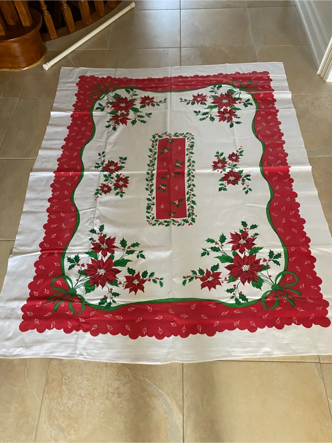 Selling a beautiful tablecloth with a festive poinsettia design! It's perfect for adding a touch of Christmas cheer to your dining table during the holidays. The red and green colours are vibrant, and the scalloped edges add a lovely detail. It's in great condition and ready to be used for many more holiday seasons