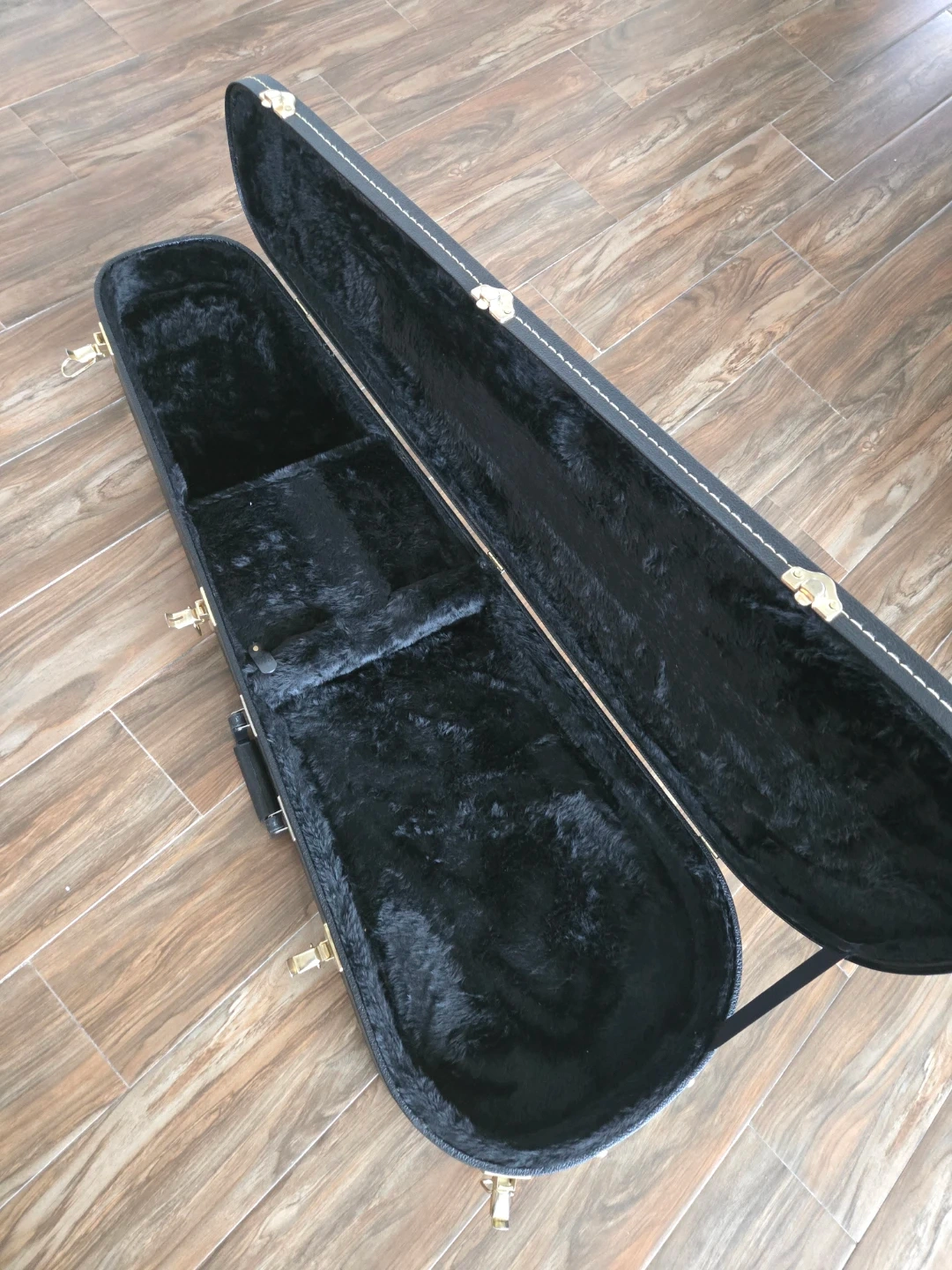 This is a black hardshell case for a guitar. It's lined with plush black fabric and features sturdy latches. Great for protecting your instrument during transport!