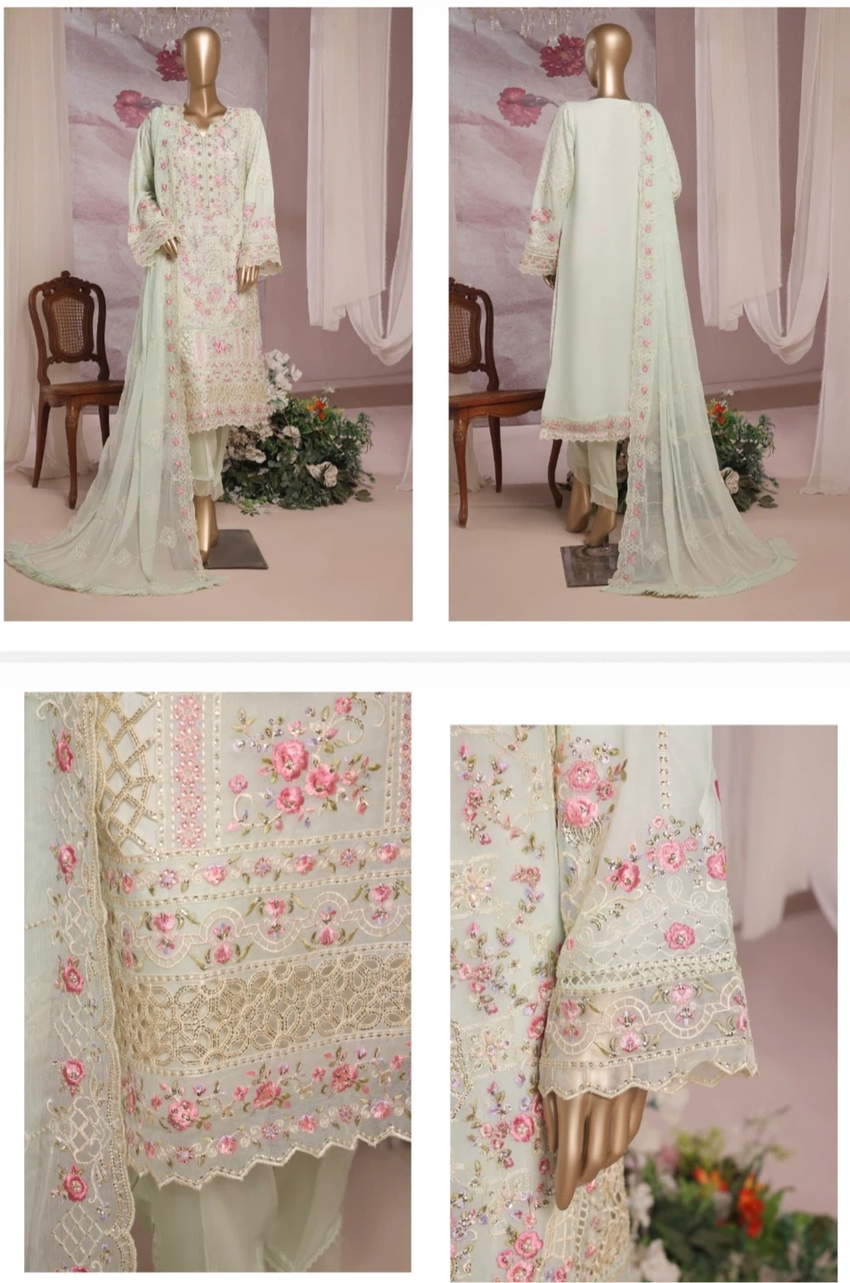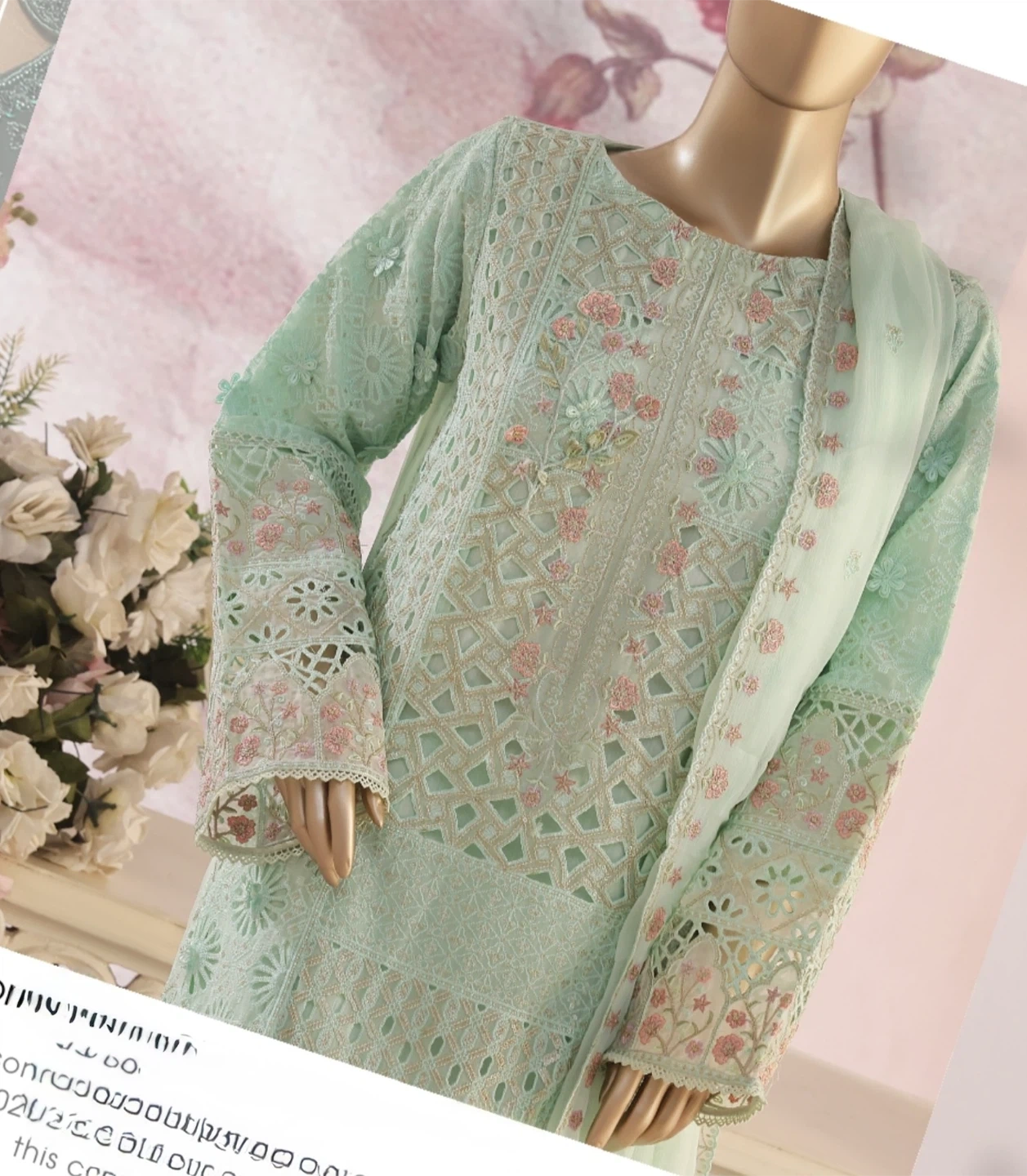This is a beautiful mint green lawn suit from Asim Jofa. It features intricate embroidery and a delicate design. Perfect for a special occasion or a stylish everyday look!