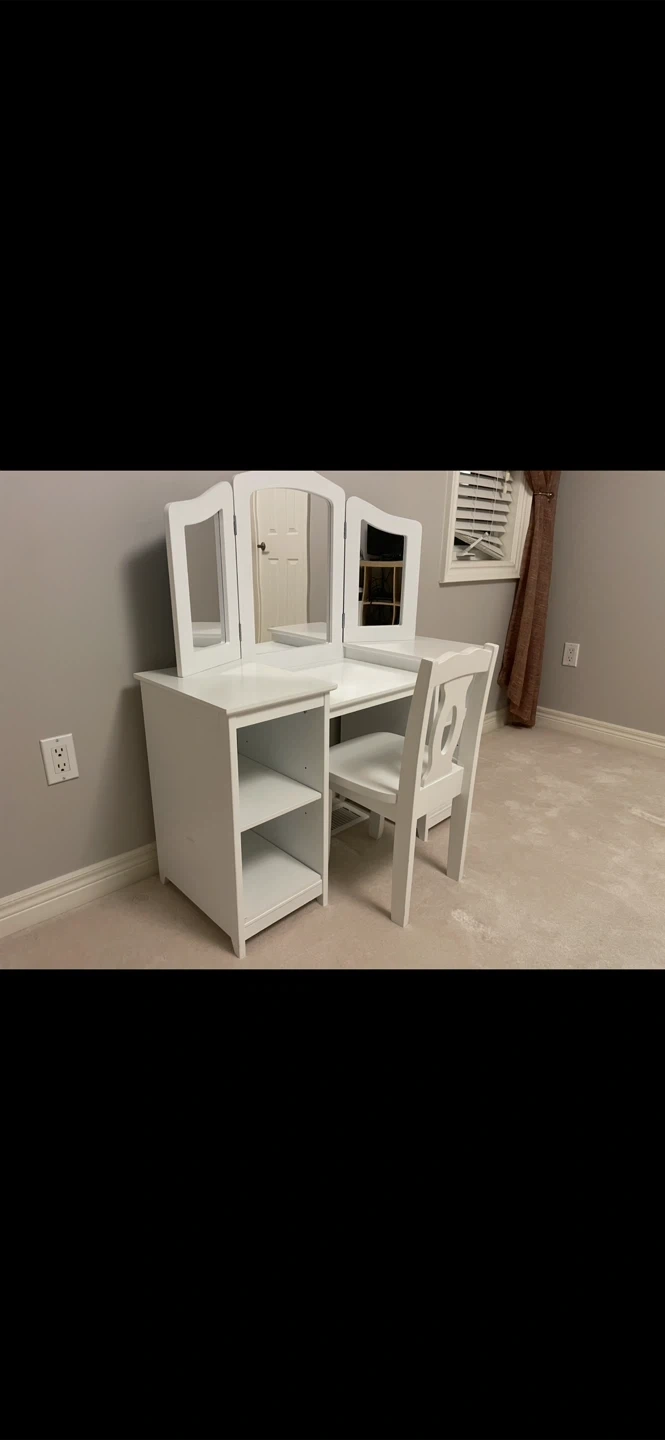 This white vanity set includes a table with a triple mirror and a matching chair. It has open shelving on both sides for storage. It's perfect for a child's bedroom or play area.