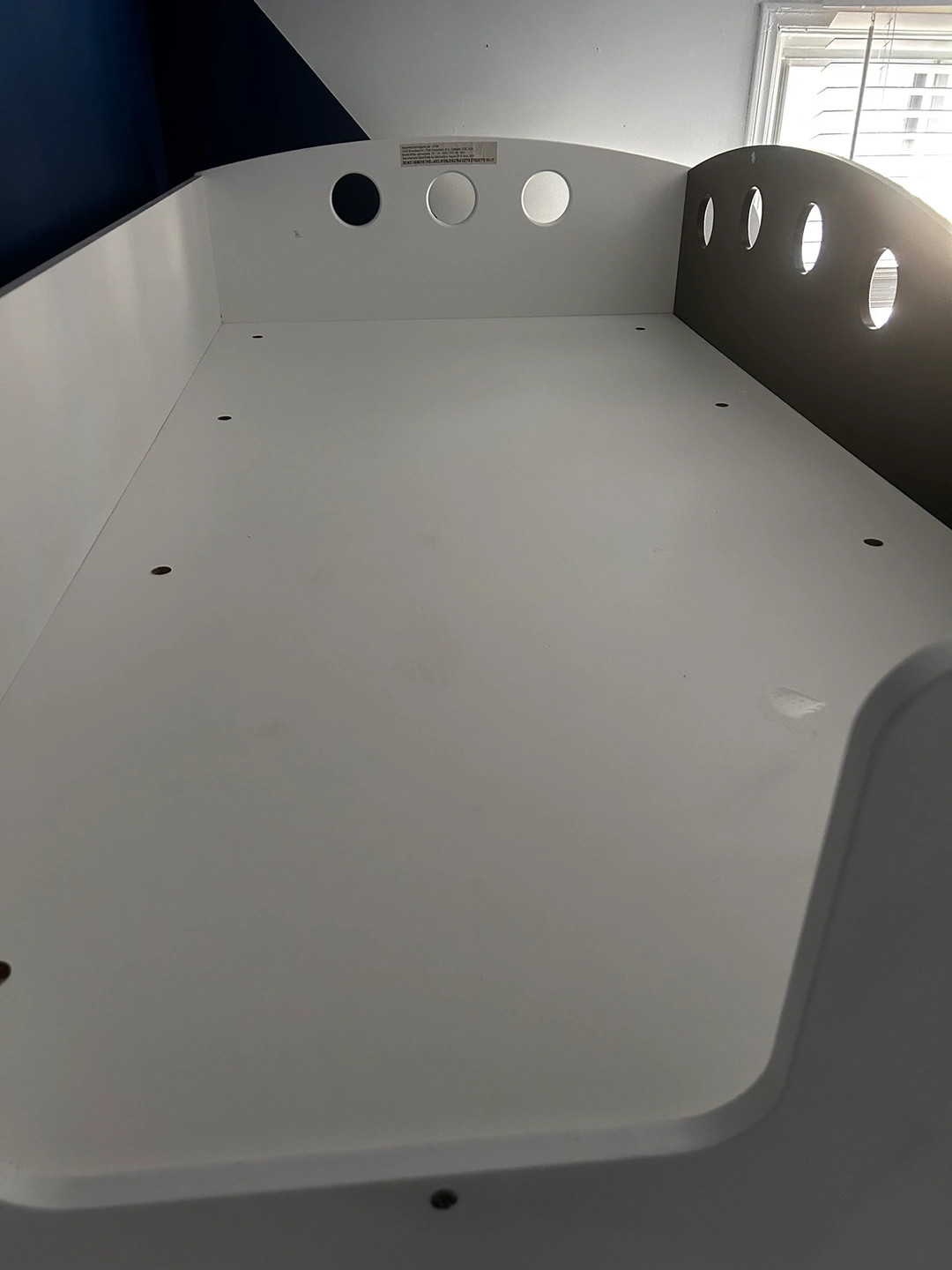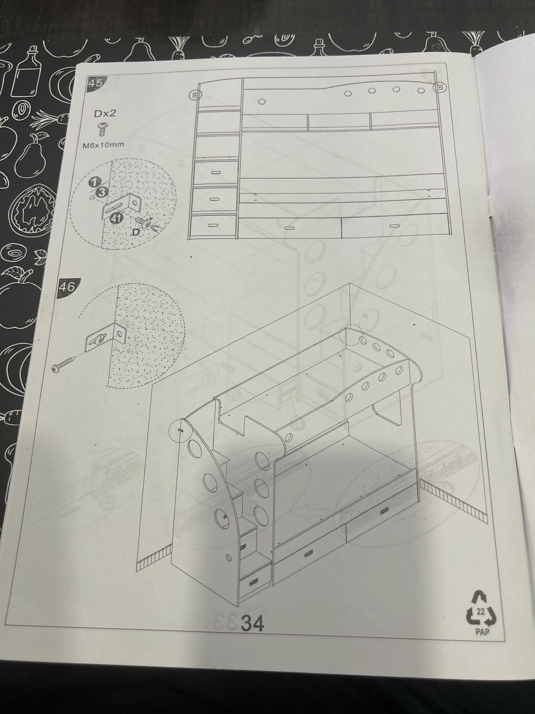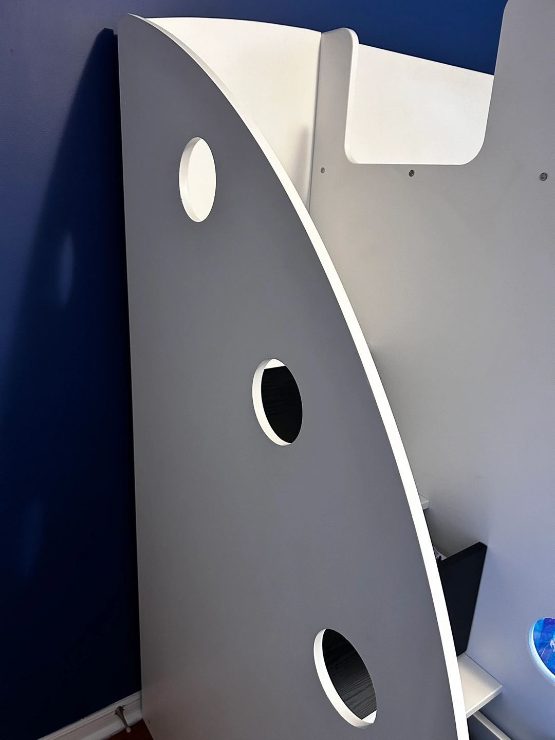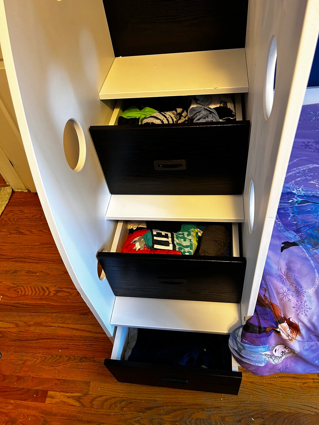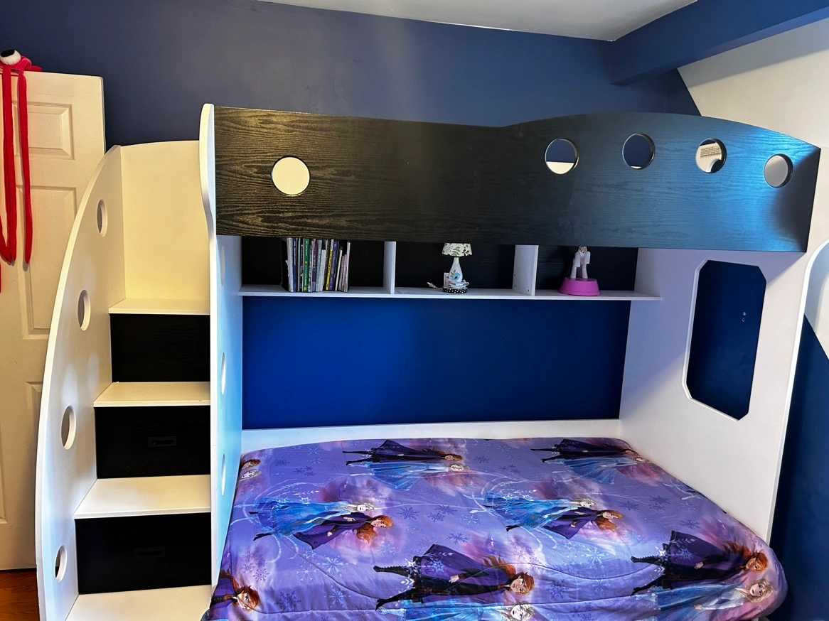 This bunk bed features a twin bed on the top and a twin bed on the bottom. It includes built-in storage in the form of drawers and shelves. The bed is white with black accents. It comes with a ladder for accessing the top bunk.