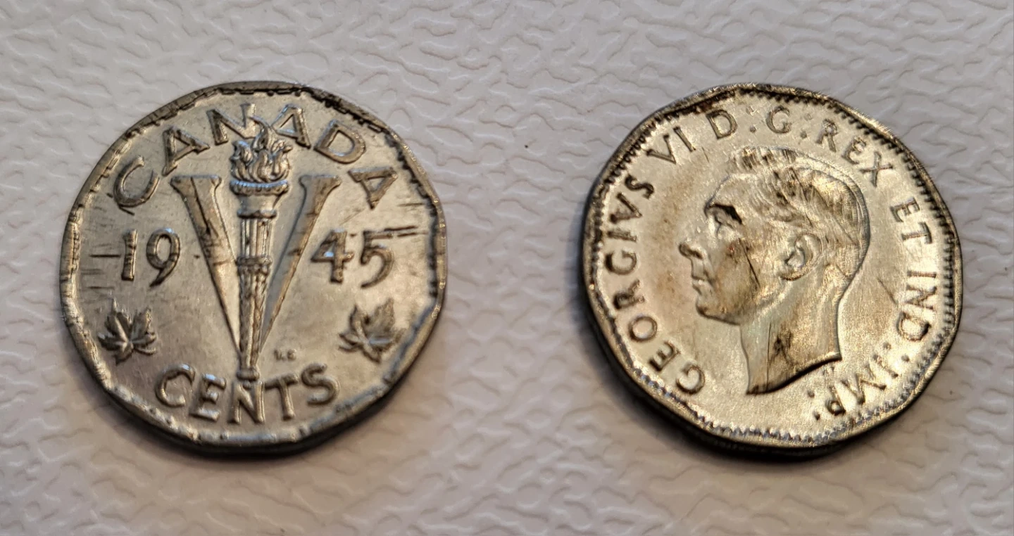 Canadian five-cent coin from 1945. Features a torch design on one side and King George VI on the other. It's made of cupro-nickel.