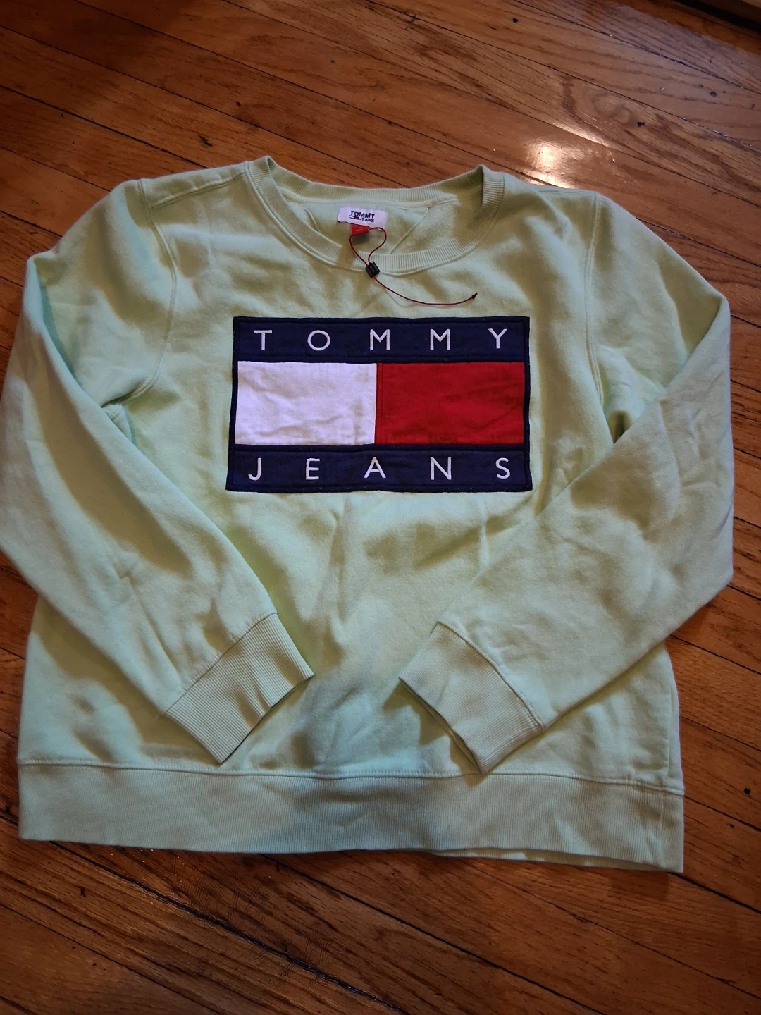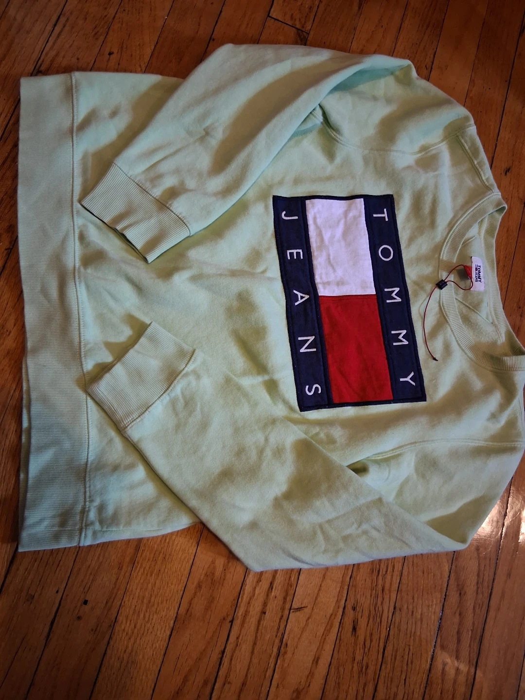 Tommy Jeans crewneck sweatshirt in a light green color. It features the classic Tommy flag logo on the front. Cotton blend material.