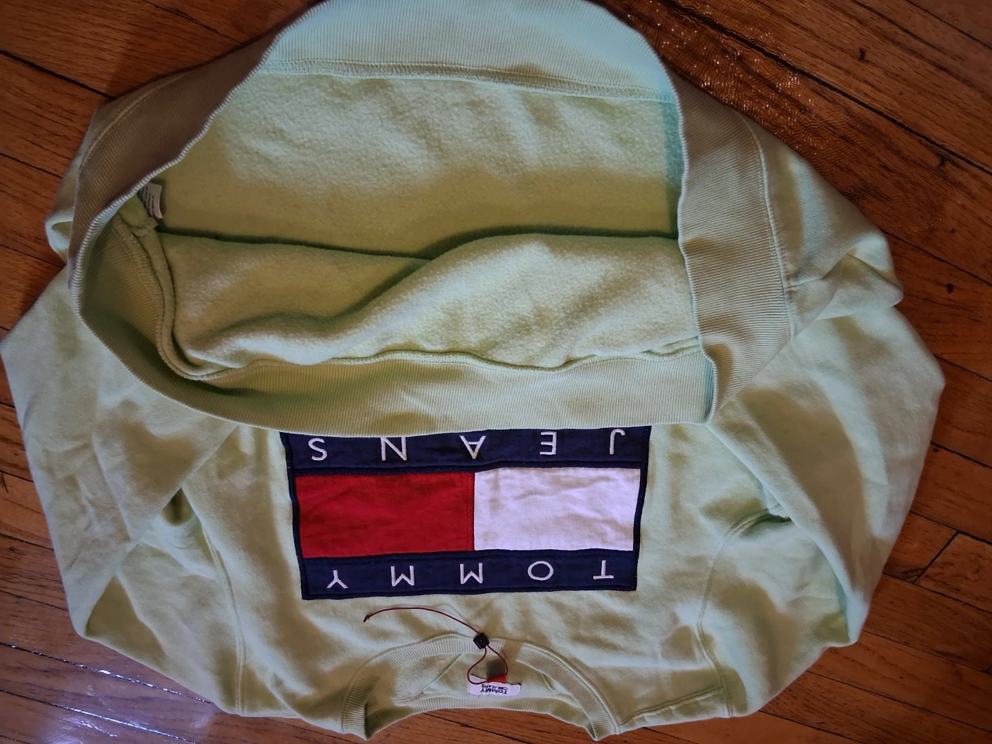 Tommy Jeans crewneck sweatshirt in a light green color. It features the classic Tommy flag logo on the front. Cotton blend material.