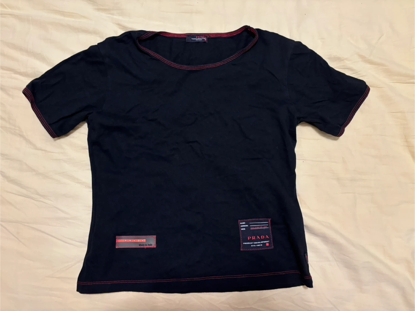 Selling a Prada black t-shirt. It features red stitching around the collar and sleeves. There are Prada labels on the front of the shirt. Made in Italy