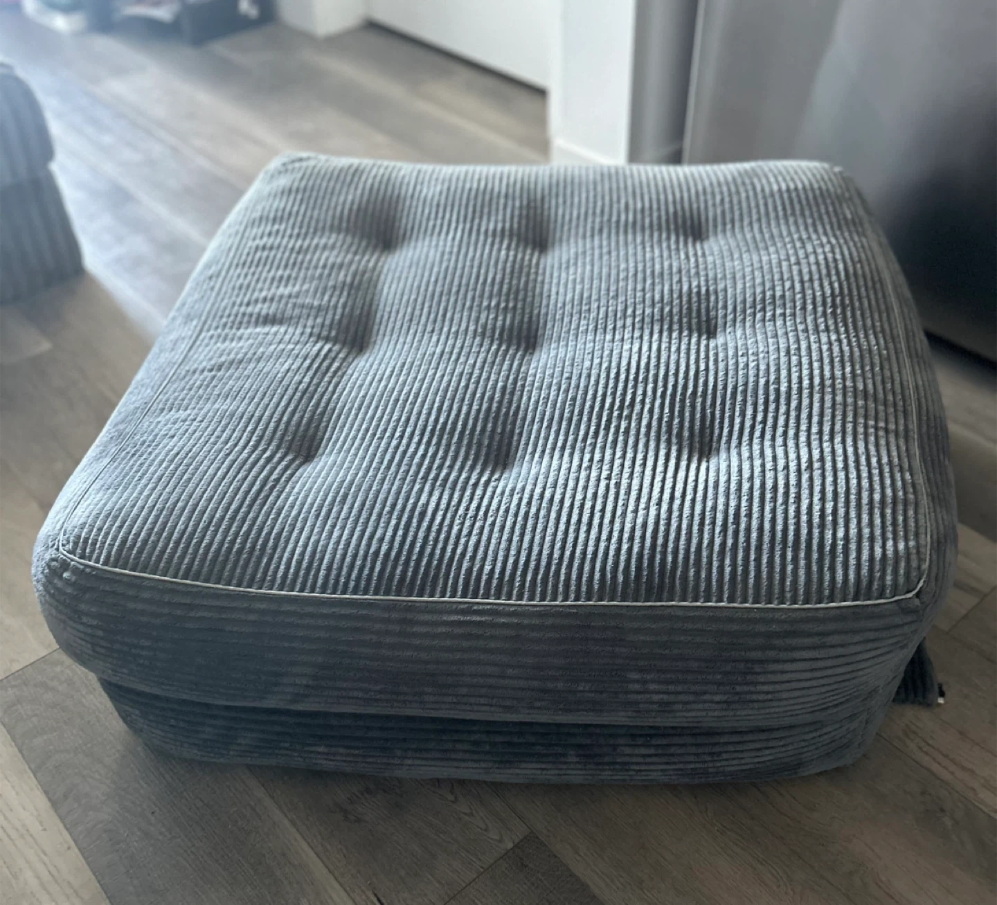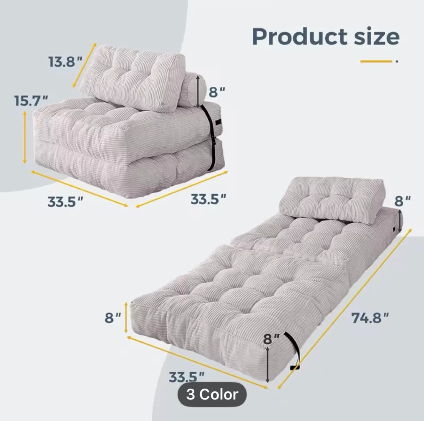 This is a 4-in-1 folding sofa bed that can be used as an ottoman or footrest. It's upholstered in grey corduroy fabric. Product dimensions are 33.5" L x 33.5" W x 15.7" H when folded as an ottoman. When unfolded as a bed, it measures 74.8" L.