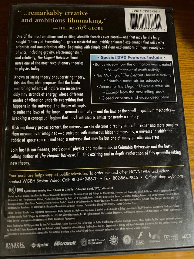 Explore the mysteries of string theory with NOVA's The Elegant Universe DVD, offering insights into superstrings, hidden dimensions, and the quest for the ultimate theory. This is a pre-owned DVD, not from another dimension (as far as I know!), but definitely a portal to another realm of thought. If the ad is still floating in the digital cosmos, then yes, it's available. This DVD is in used, good condition. Cash is accepted.