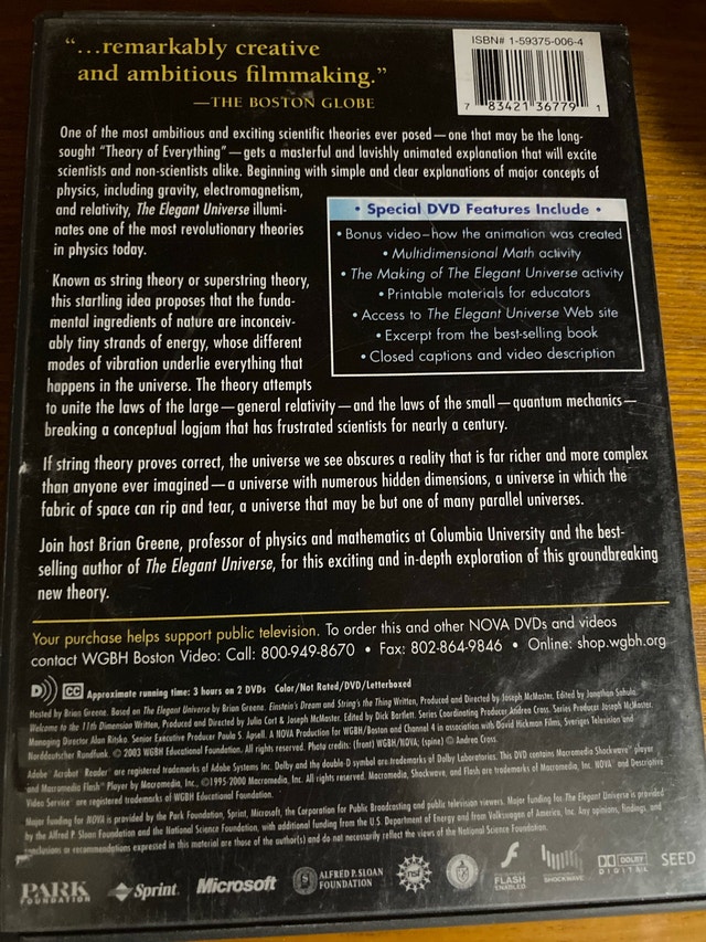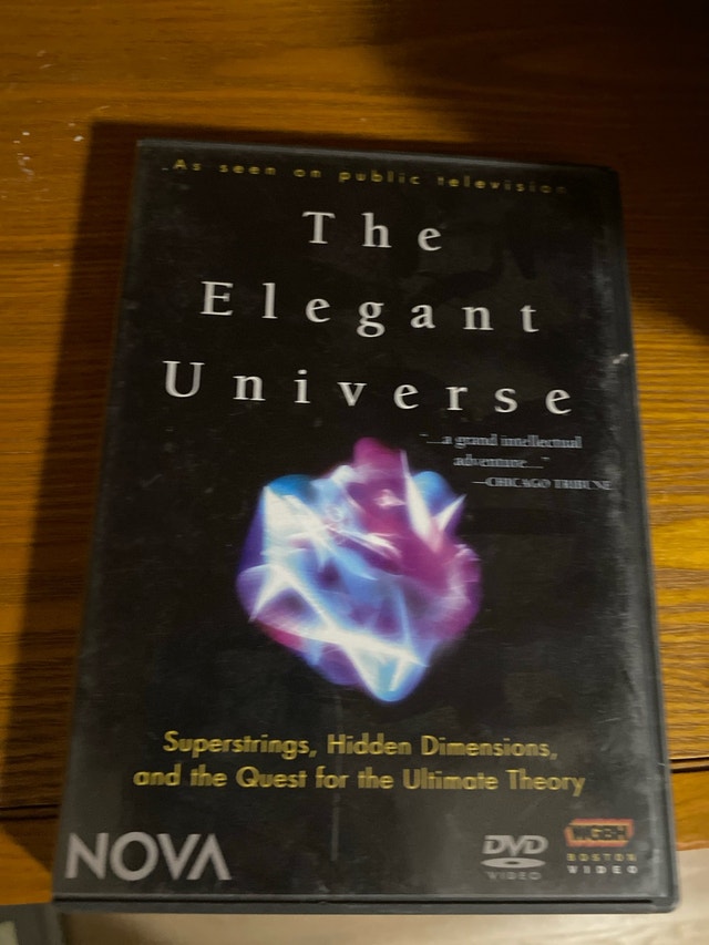 Explore the mysteries of string theory with NOVA's The Elegant Universe DVD, offering insights into superstrings, hidden dimensions, and the quest for the ultimate theory. This is a pre-owned DVD, not from another dimension (as far as I know!), but definitely a portal to another realm of thought. If the ad is still floating in the digital cosmos, then yes, it's available. This DVD is in used, good condition. Cash is accepted.