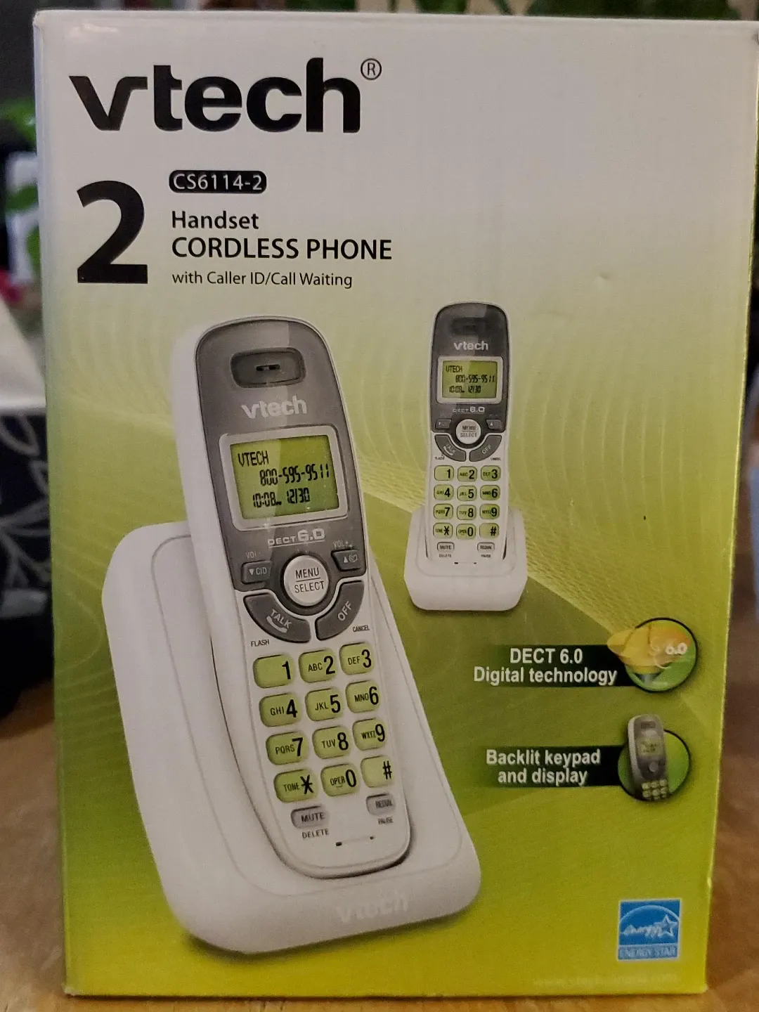 This is a VTech CS6114-2 cordless phone set. It features DECT 6.0 digital technology for clear calls. The handsets have backlit keypads and displays for easy use.