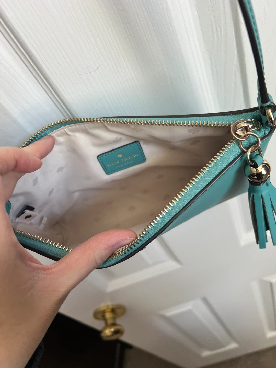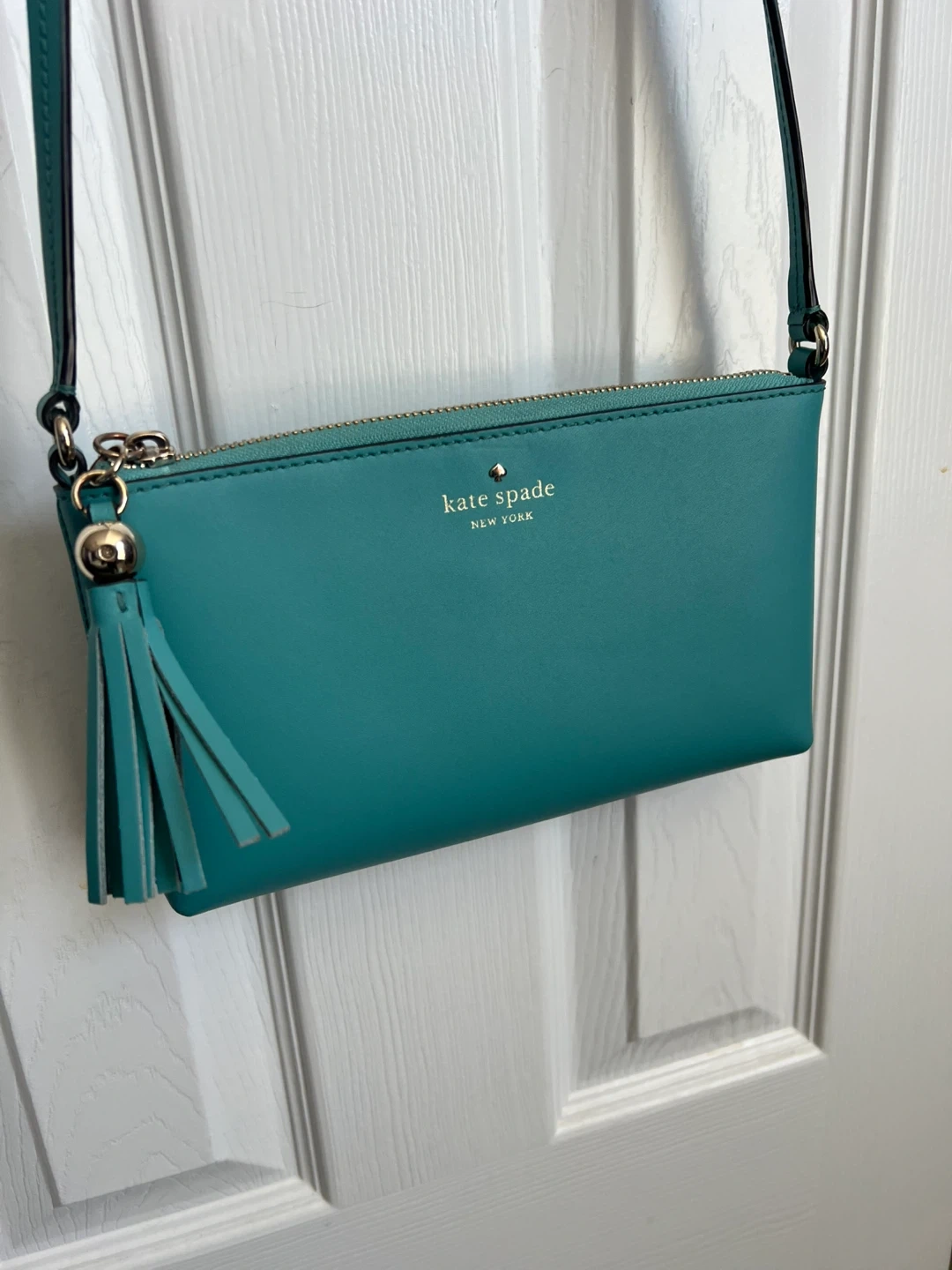 Kate Spade crossbody bag in a vibrant turquoise colour. It's made of leather and features a cute tassel detail on the zipper. Perfect for carrying essentials when you're on the go!