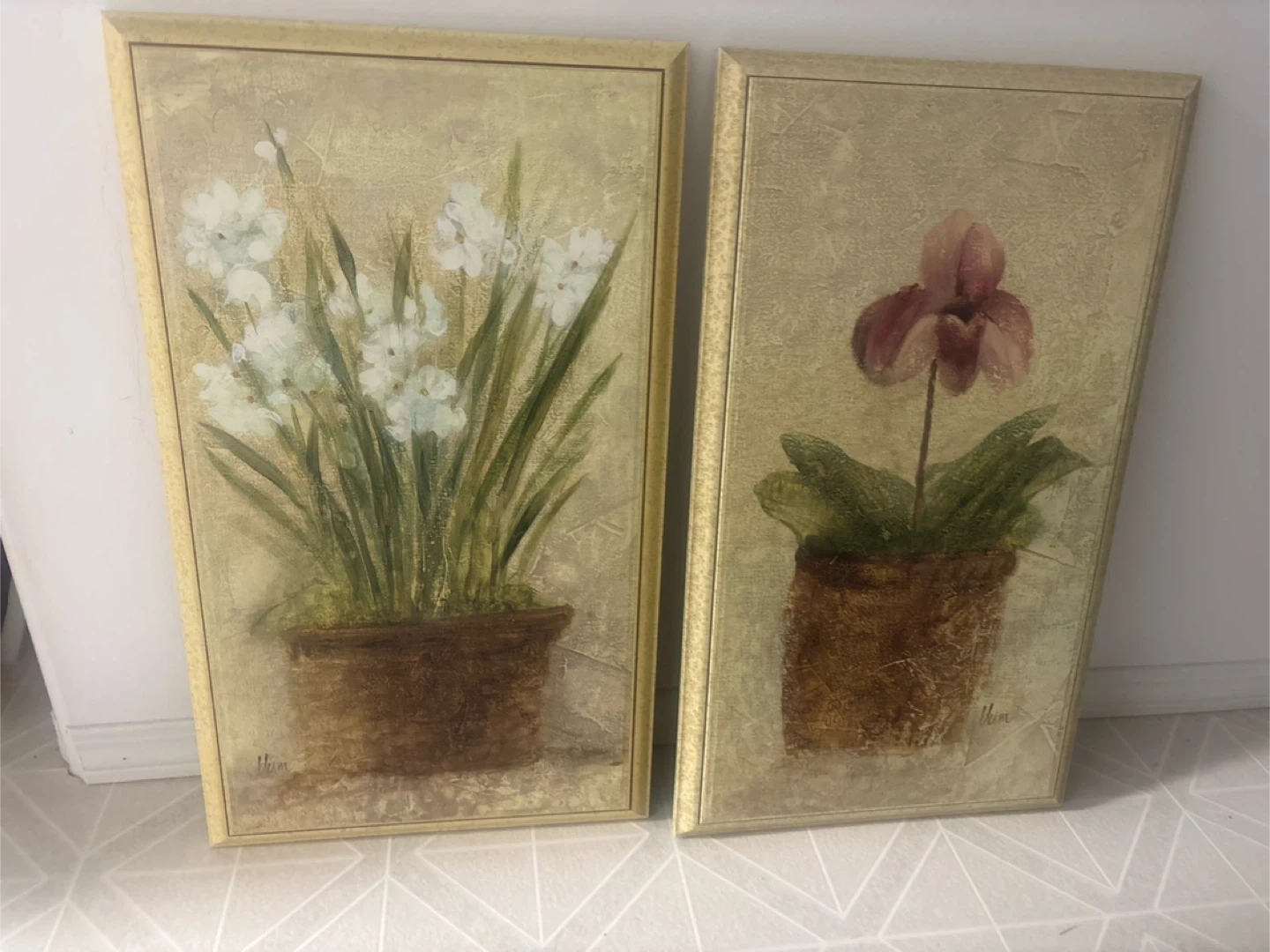 This set includes two framed art prints featuring floral designs in pots. The left print shows white flowers, and the right shows a pink orchid. Both have gold-toned frames and a textured background. Pick up cash only