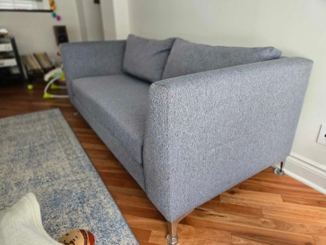 This elegant Mikaza sofa offers both style and comfort for your living space. It has been gently enjoyed for 6 years and remains in excellent condition, ready to enhance your home decor. Model: G Romano, Canadian made. Colour: Gray Blue. Dimensions: 78 inches wide, 38 inches deep, 30 inches high. Seat depth is 21 inches. Cash accepted.