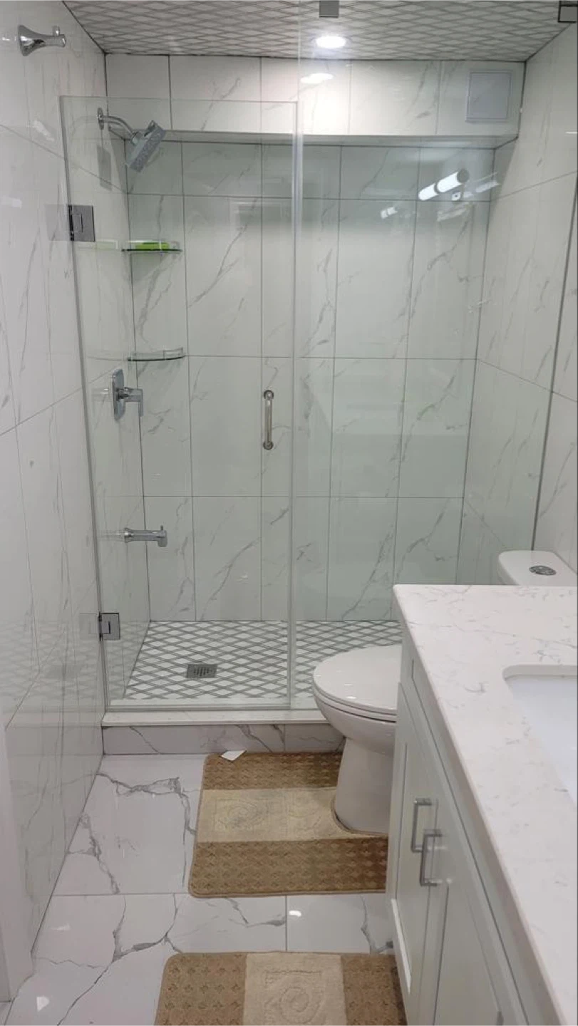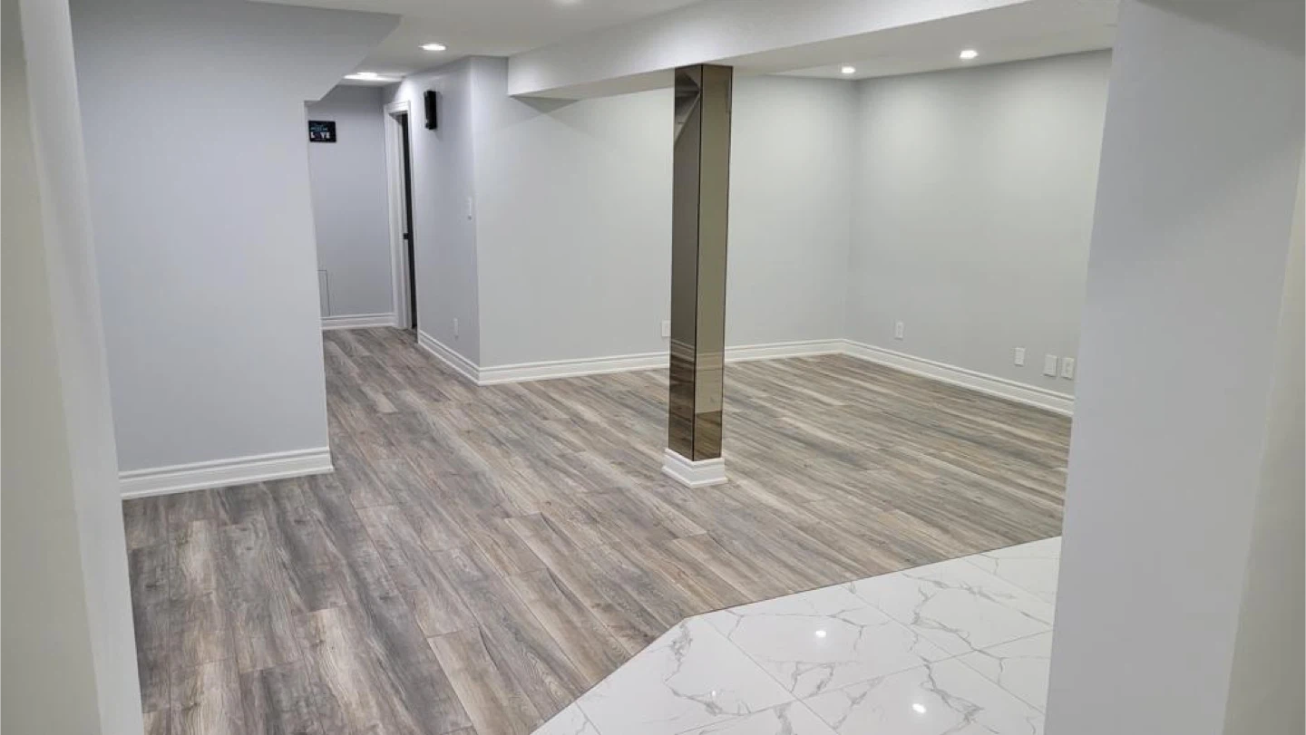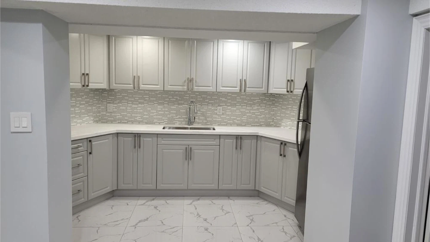 Beautifully renovated basement featuring modern laminate flooring and sleek marble-look tiles. Includes a functional kitchen with light grey cabinetry and a stainless steel fridge, plus a stylish 3-piece bathroom with a glass-enclosed shower. This space is perfect for a rental unit or in-law suite!msg for more info