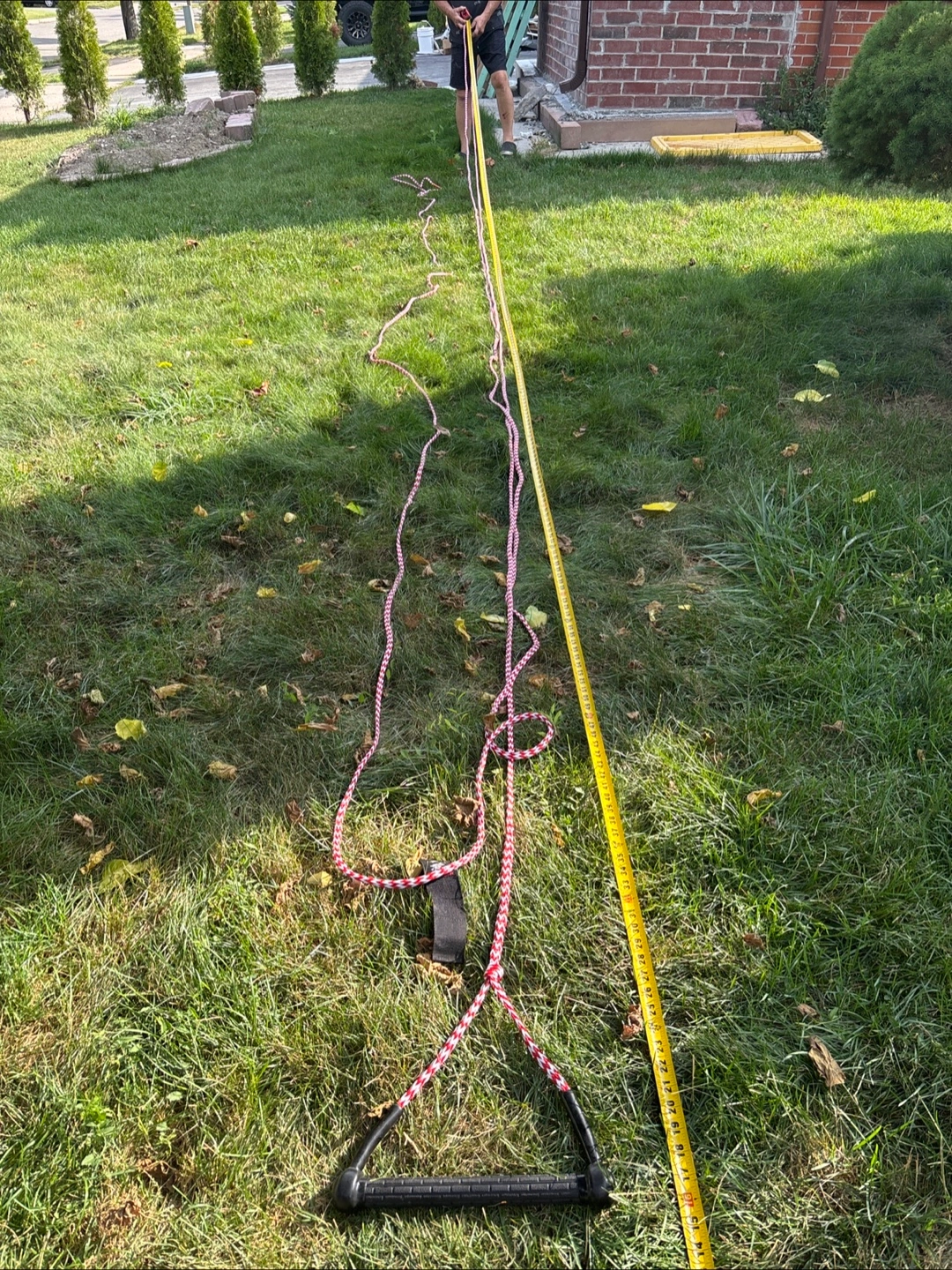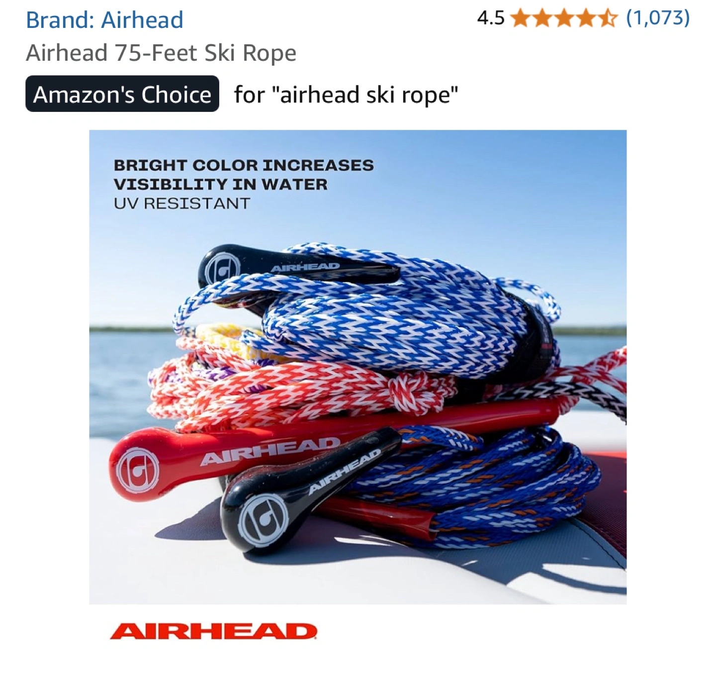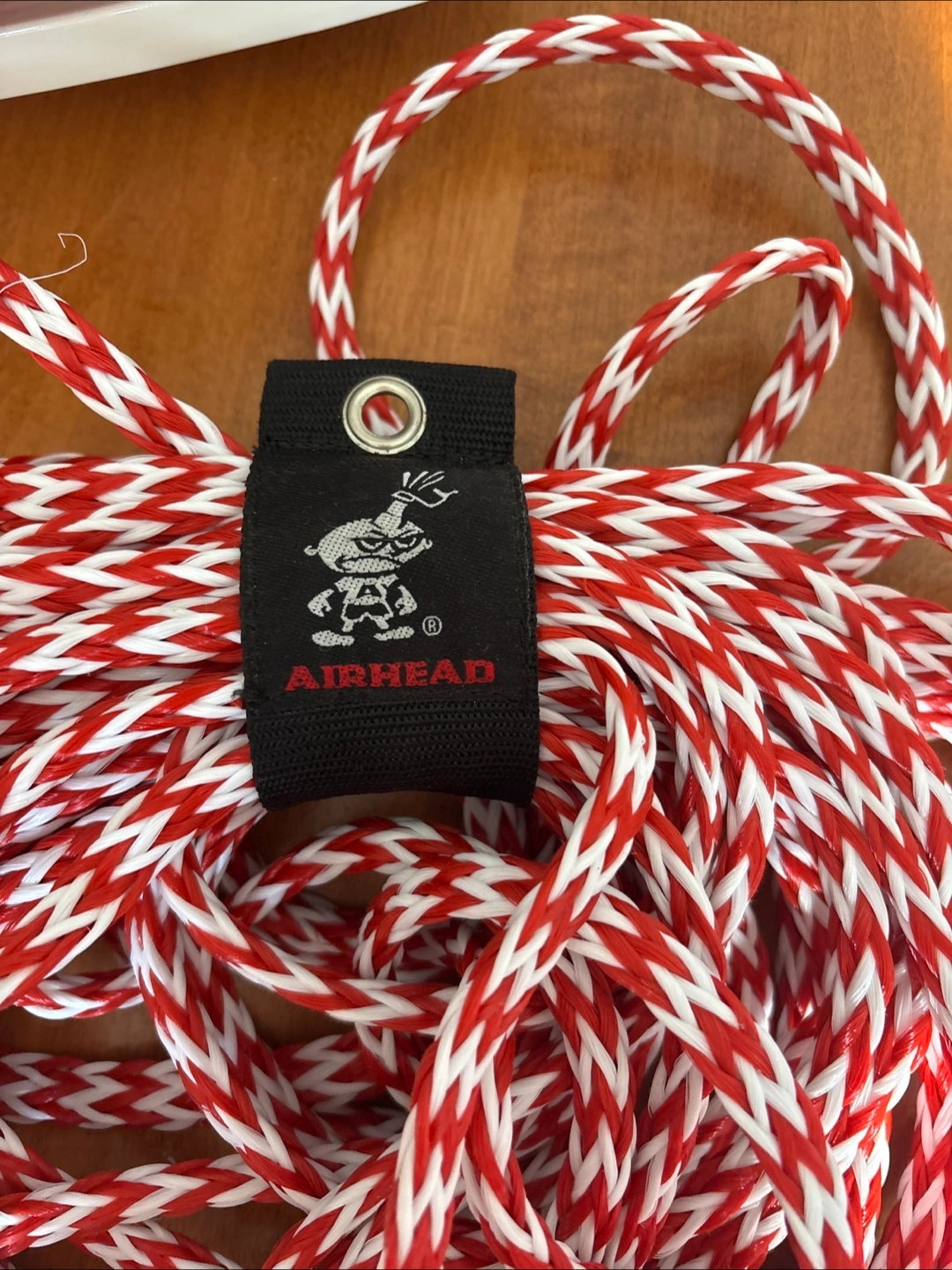 Selling an Airhead 75-foot ski rope! The rope is red and white, and it comes with a black handle. It's UV resistant, so it's perfect for use in the water. The bright colour also increases visibility in the water, so you can easily spot it.
