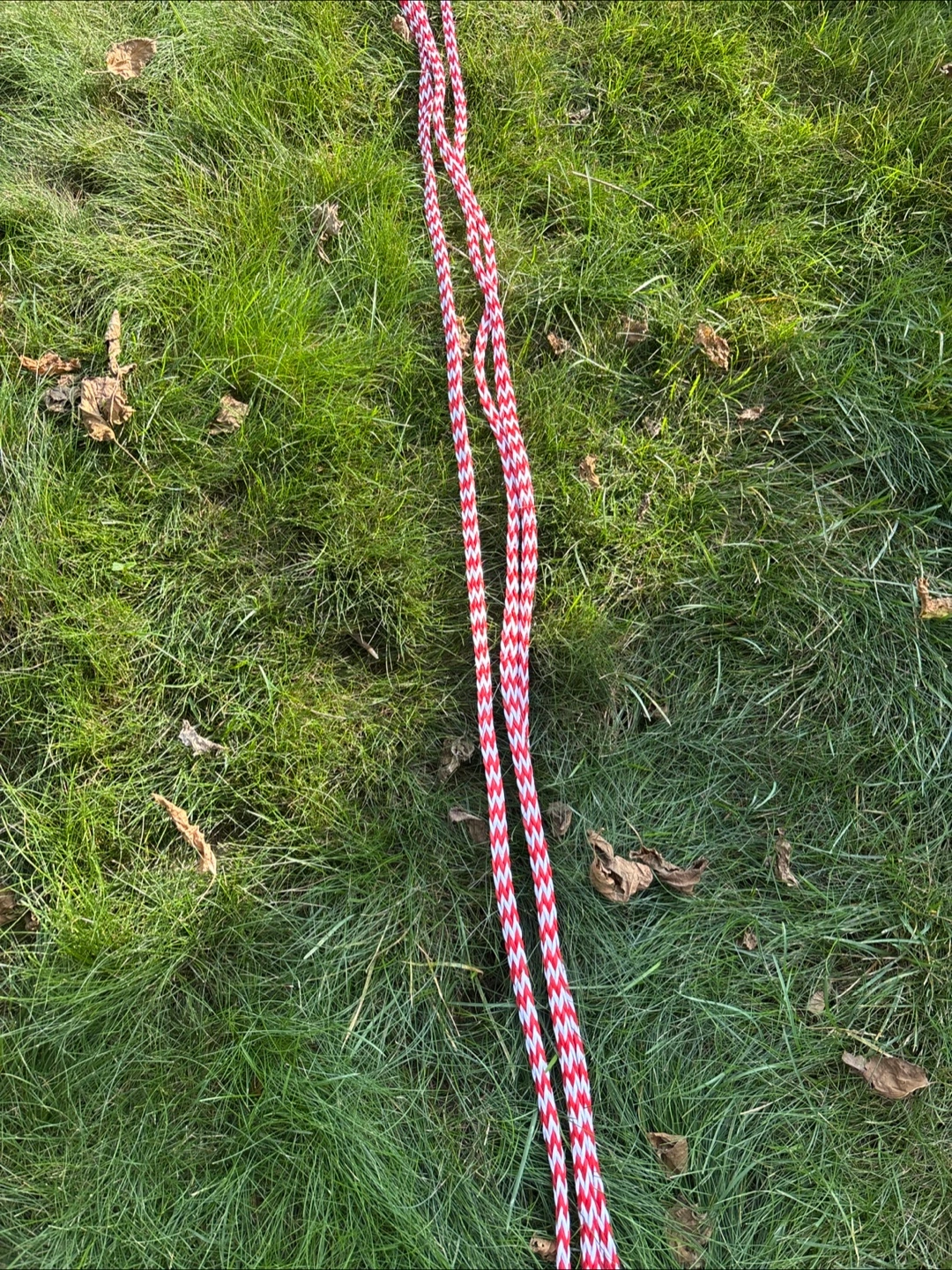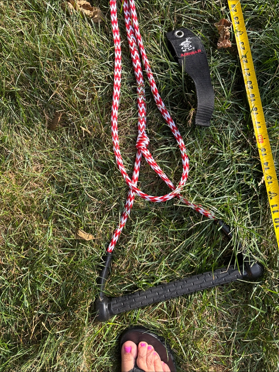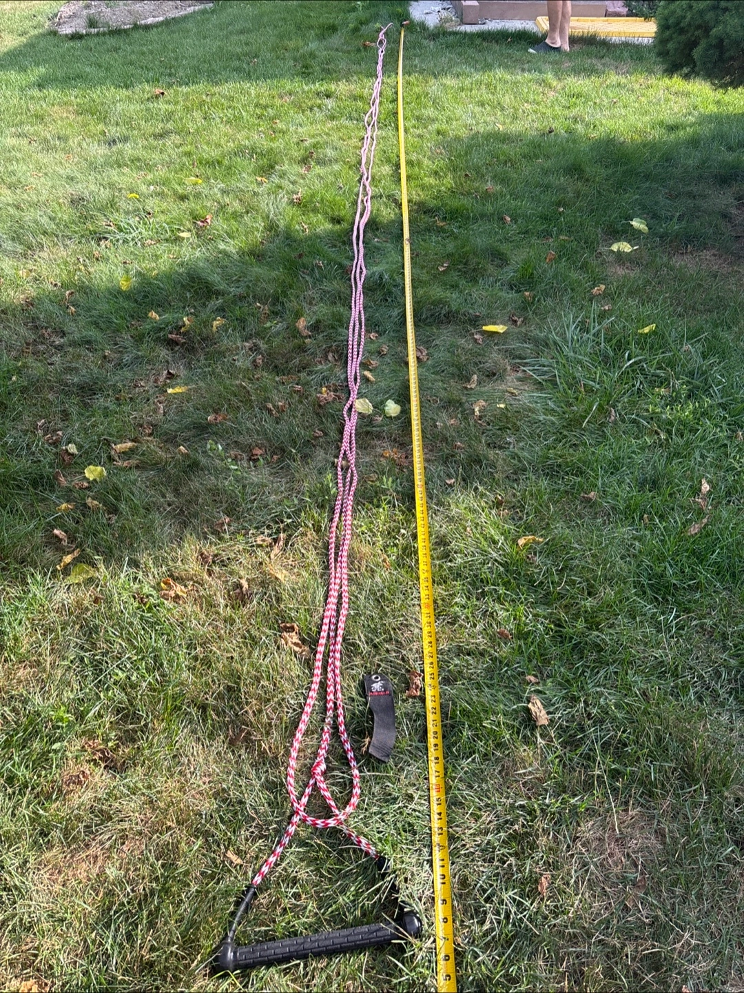 Selling an Airhead 75-foot ski rope! The rope is red and white, and it comes with a black handle. It's UV resistant, so it's perfect for use in the water. The bright colour also increases visibility in the water, so you can easily spot it.