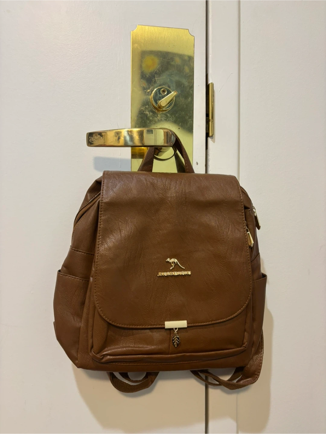 This brown faux leather backpack features a stylish flap closure with a small leaf charm. It has multiple zippered pockets and side pouches for extra storage. The adjustable straps ensure a comfortable fit.