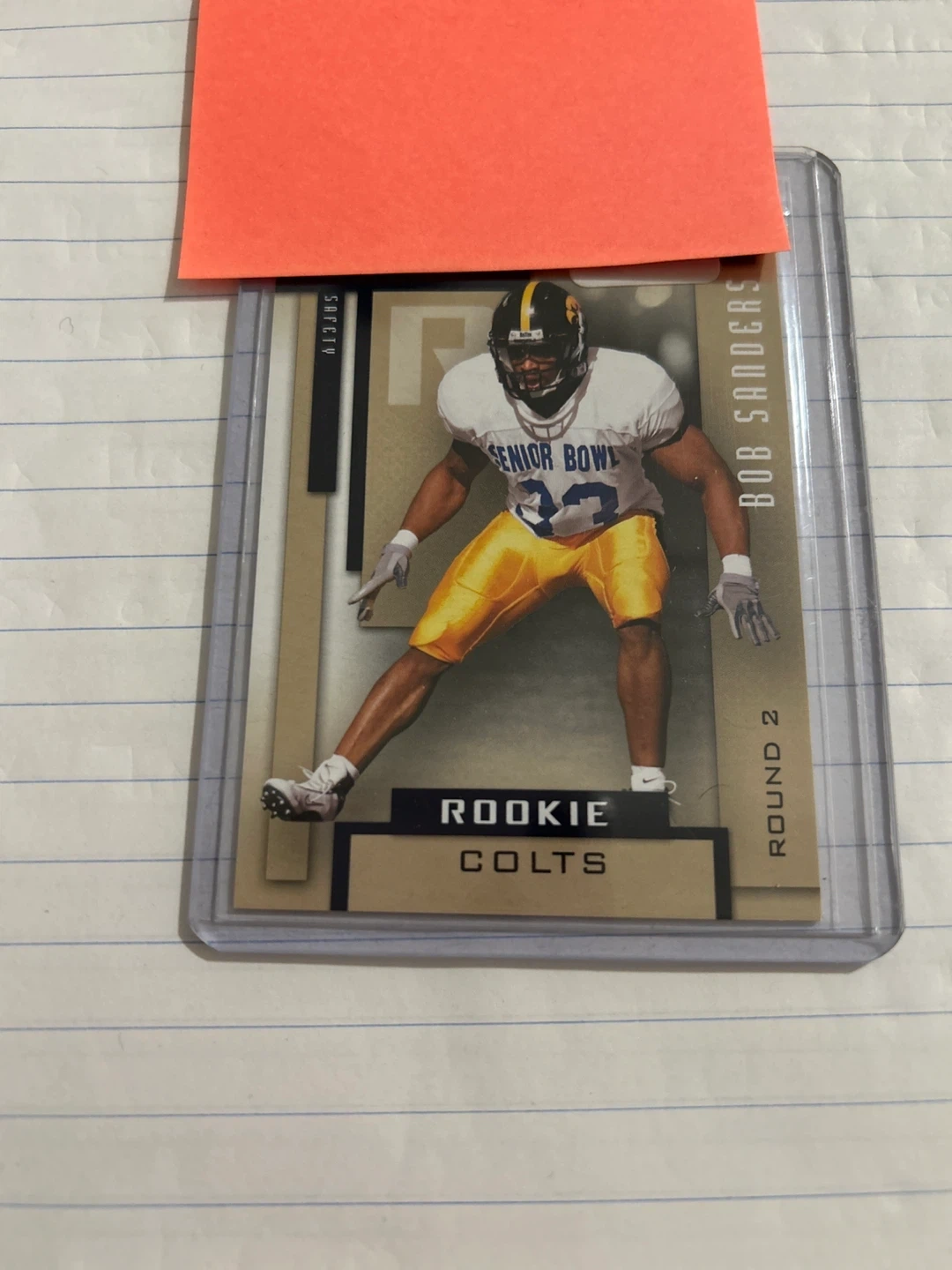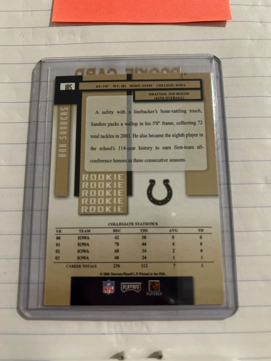 This is a 2004 Playoff Bob Sanders Rookie football card for the Colts. It features his collegiate statistics and draft information. Card is in a protective sleeve.
