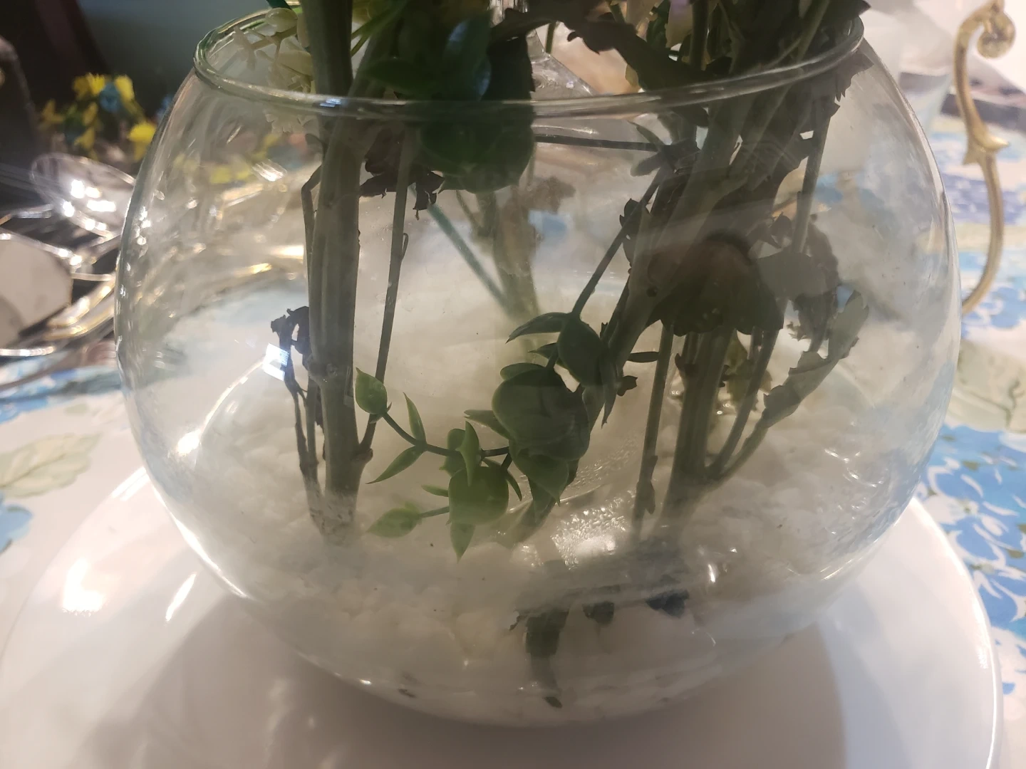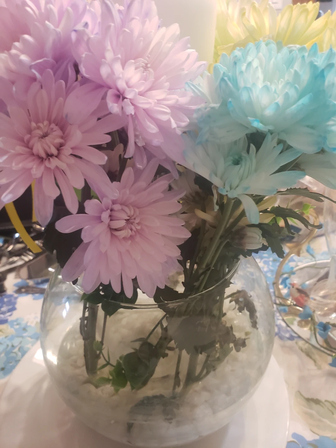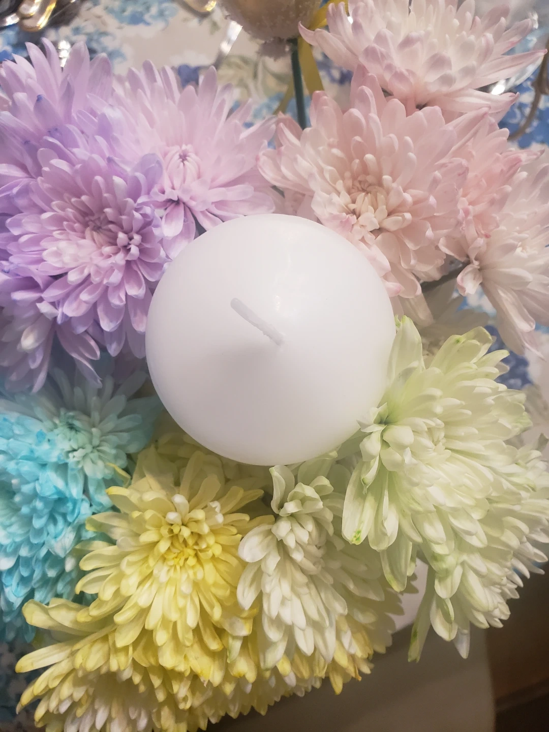 A clear glass vase filled with decorative white stones and a cluster of colourful artificial chrysanthemums. It also includes a white pillar candle nestled in the centre of the flowers. This arrangement adds a touch of colour and style to any room.