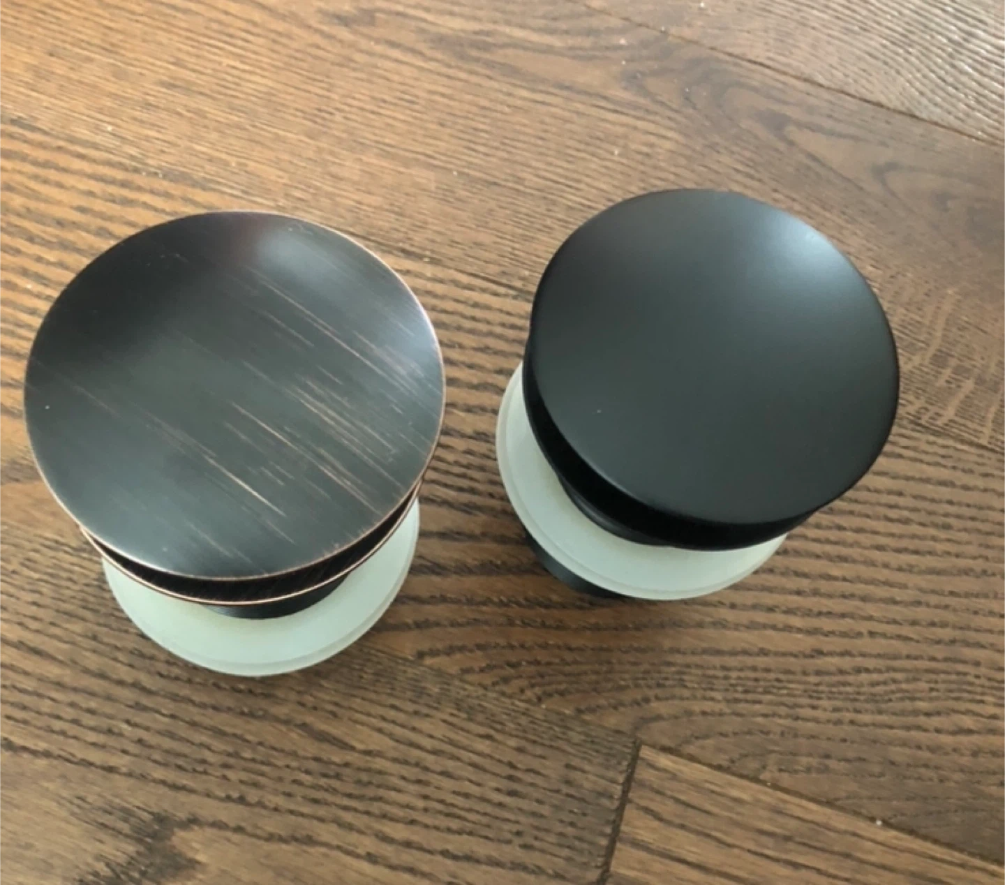 A brass matte bronze push-up drain stopper for a bath tub. It measures approximately 3.6 inches in height and 1.85 inches in diameter.
