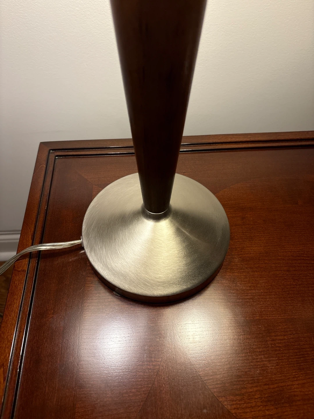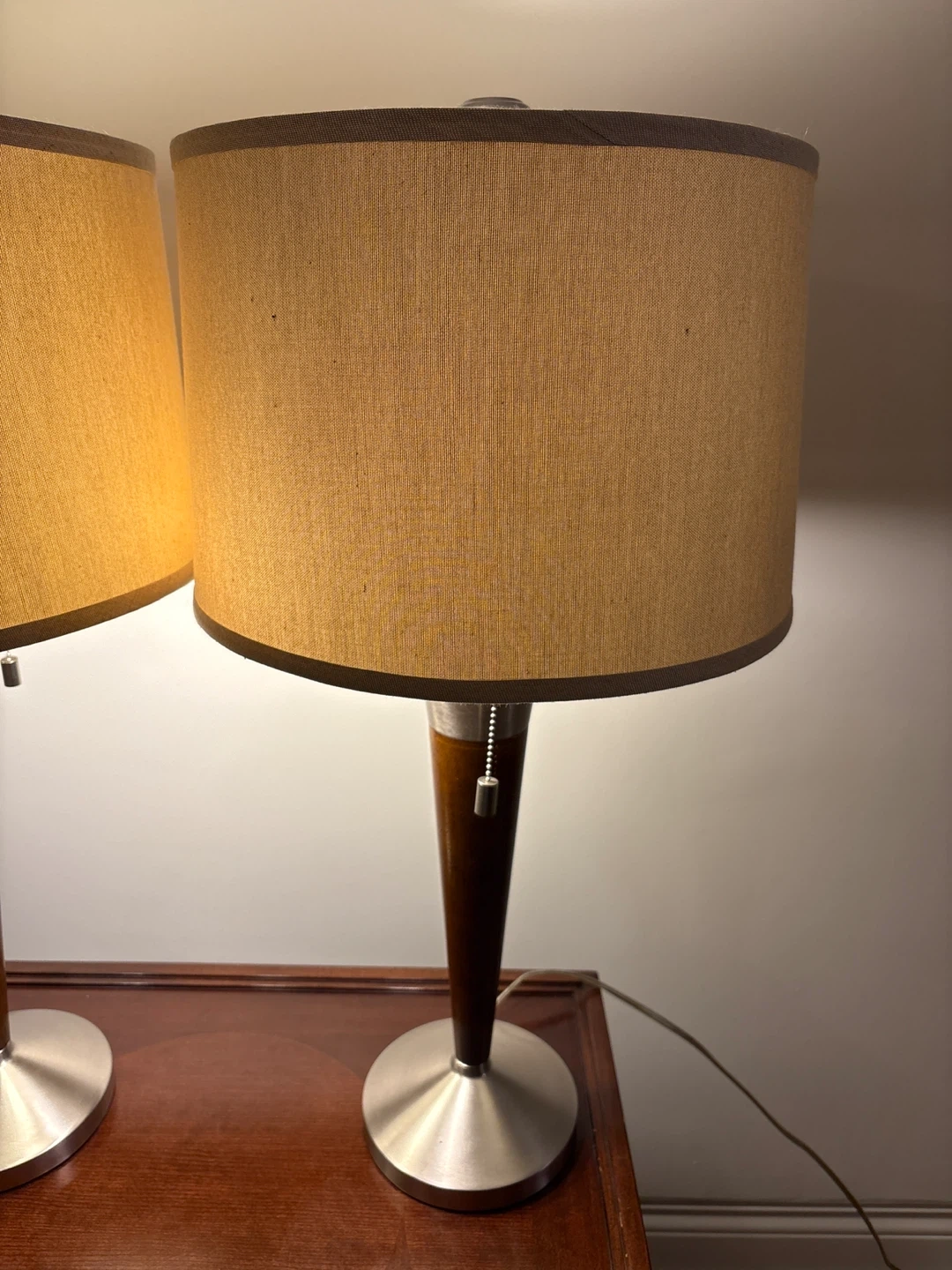 These two table lamps feature a sleek design with brushed nickel bases and dark brown tapered wooden accents. They come with neutral beige drum shades that offer a warm glow. It's a lovely set for any living room or bedroom!
