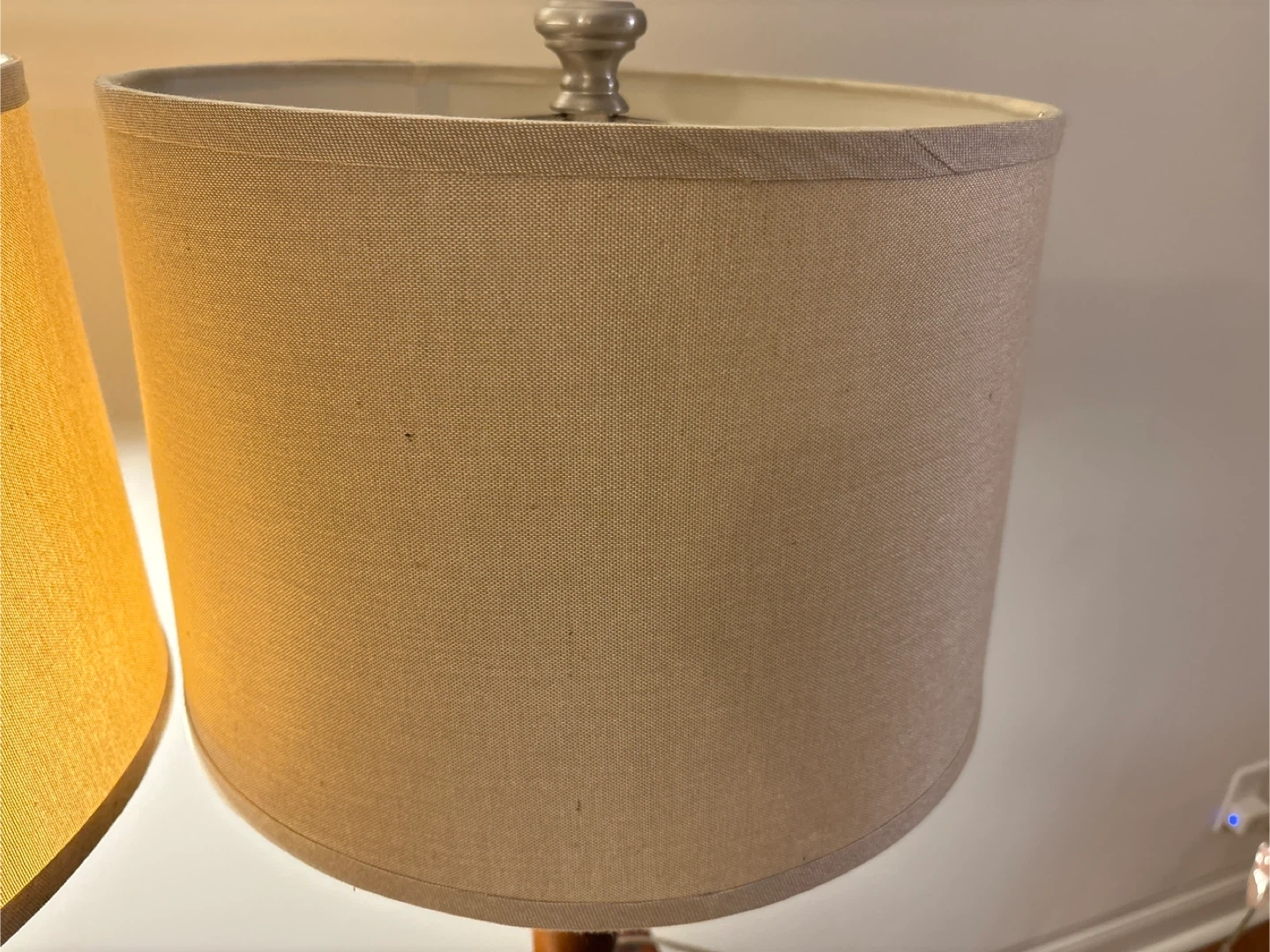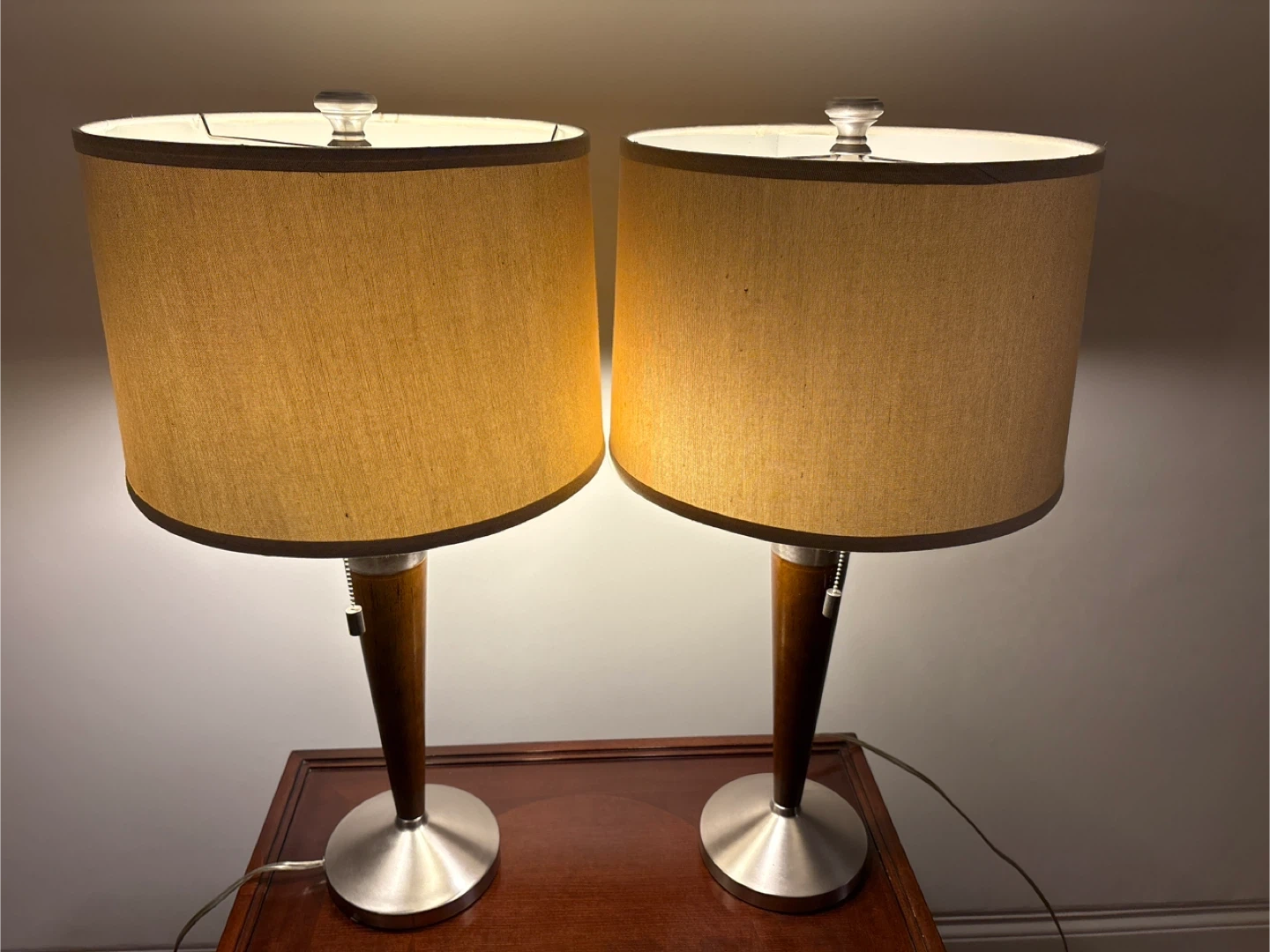 These two table lamps feature a sleek design with brushed nickel bases and dark brown tapered wooden accents. They come with neutral beige drum shades that offer a warm glow. It's a lovely set for any living room or bedroom!