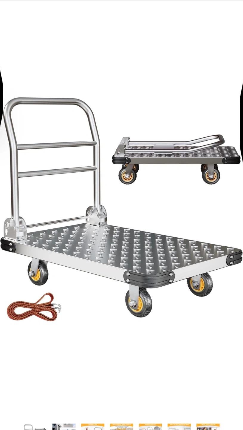 This Noliven foldable platform truck is designed for heavy-duty use. It features a durable steel construction and 6-inch swivel wheels for easy maneuverability. The cart can be folded for convenient storage. It has a weight capacity of 2000 lbs.