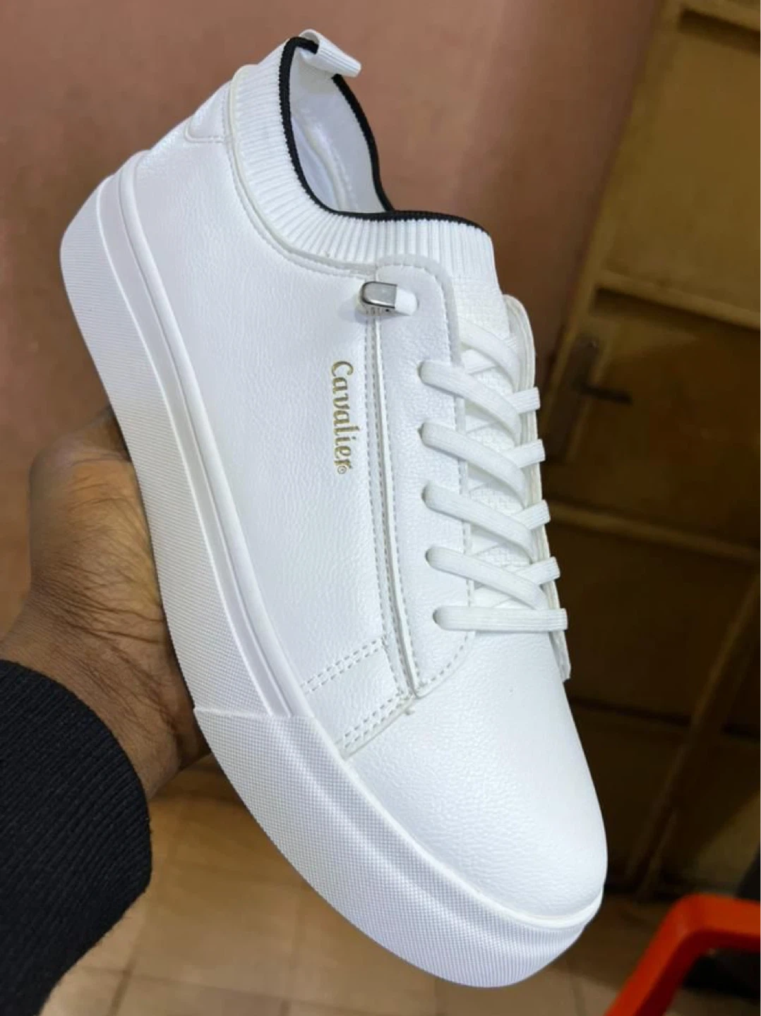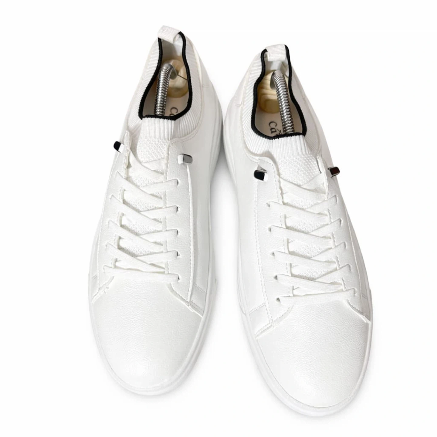 These are white leather sneakers from Cavalier. They feature a lace-up closure and a sleek design. The soles are white rubber with a textured pattern for grip.