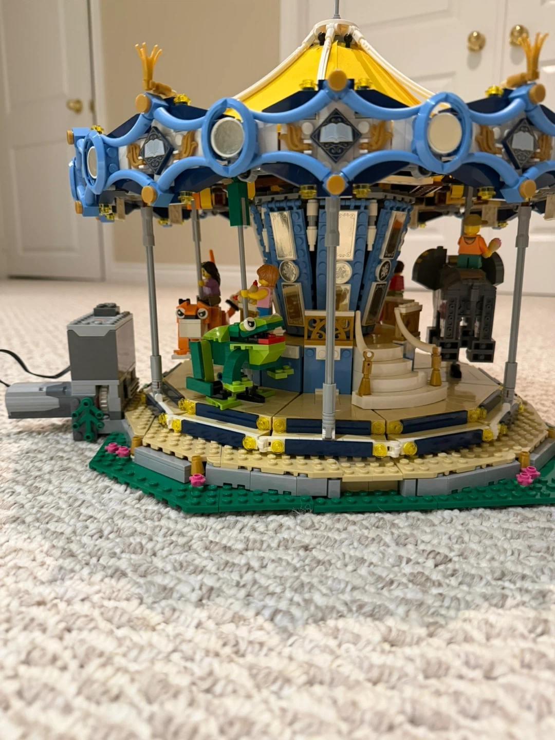 This is the LEGO Creator Expert Carousel set, item number 10257. It's a detailed and colourful build with various animal rides. The set includes the motor for movement. It's a fun display piece for LEGO enthusiasts!