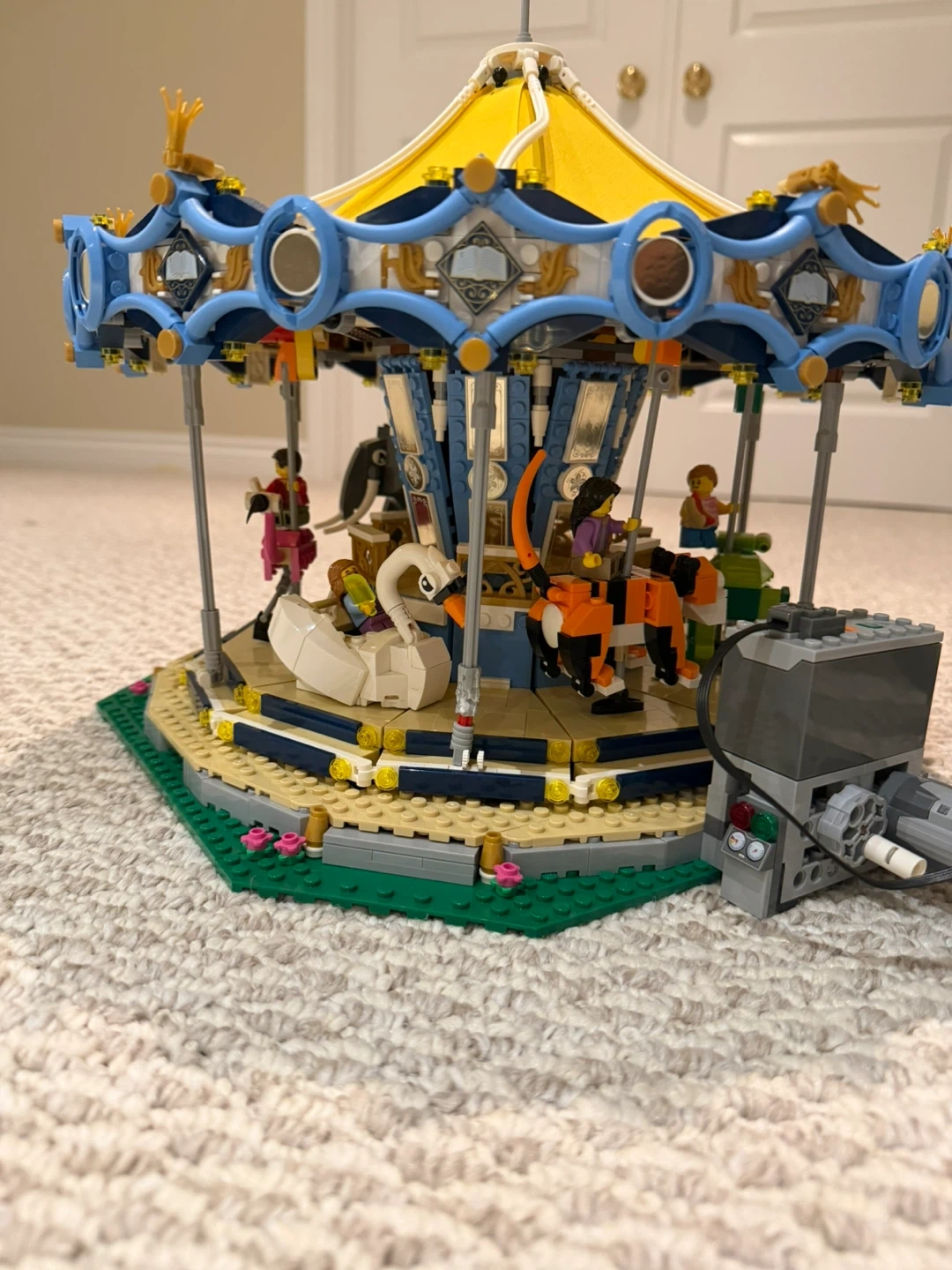 This is the LEGO Creator Expert Carousel set, item number 10257. It's a detailed and colourful build with various animal rides. The set includes the motor for movement. It's a fun display piece for LEGO enthusiasts!