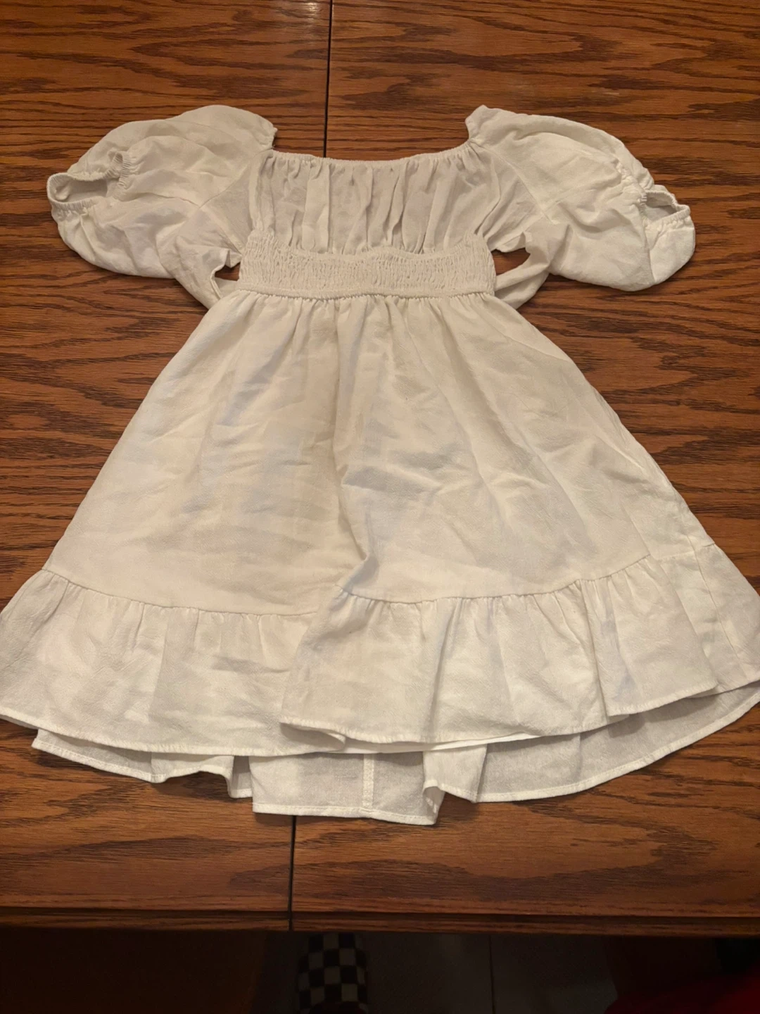 This sweet white dress features puff sleeves open back with a tie . It has a ruffles for an extra touch of charm.