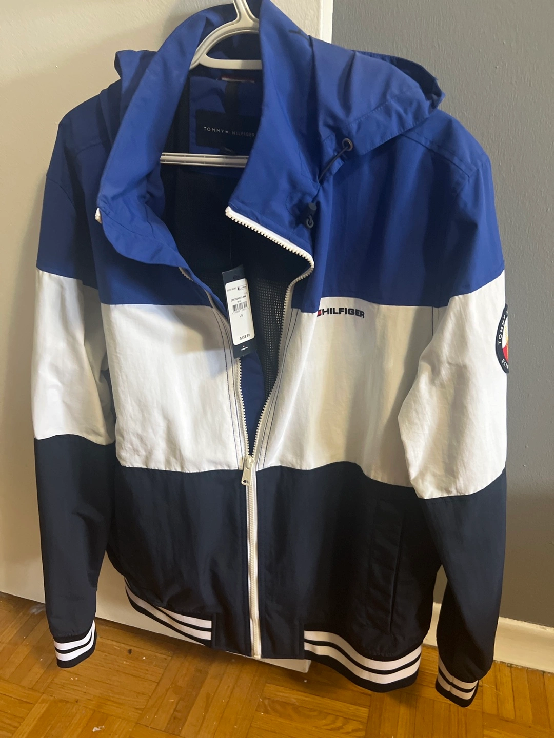 Brand new Tommy Hilfiger spring jacket. Size large . Brand new retails for 159.00. Hoodie folds and tucks way.