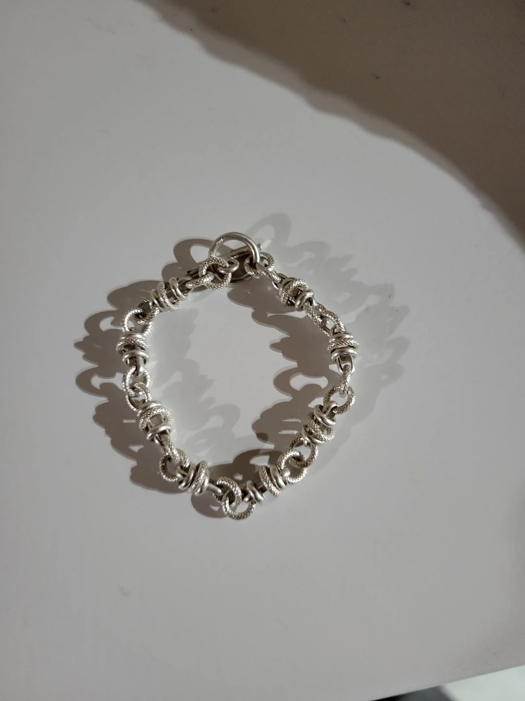 This sterling silver bracelet features a unique knotted chain design. It's secured with a toggle clasp. It measures approximately 7 inches in length.