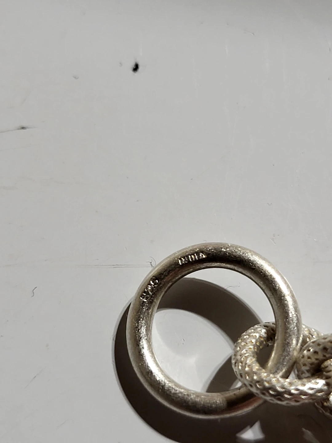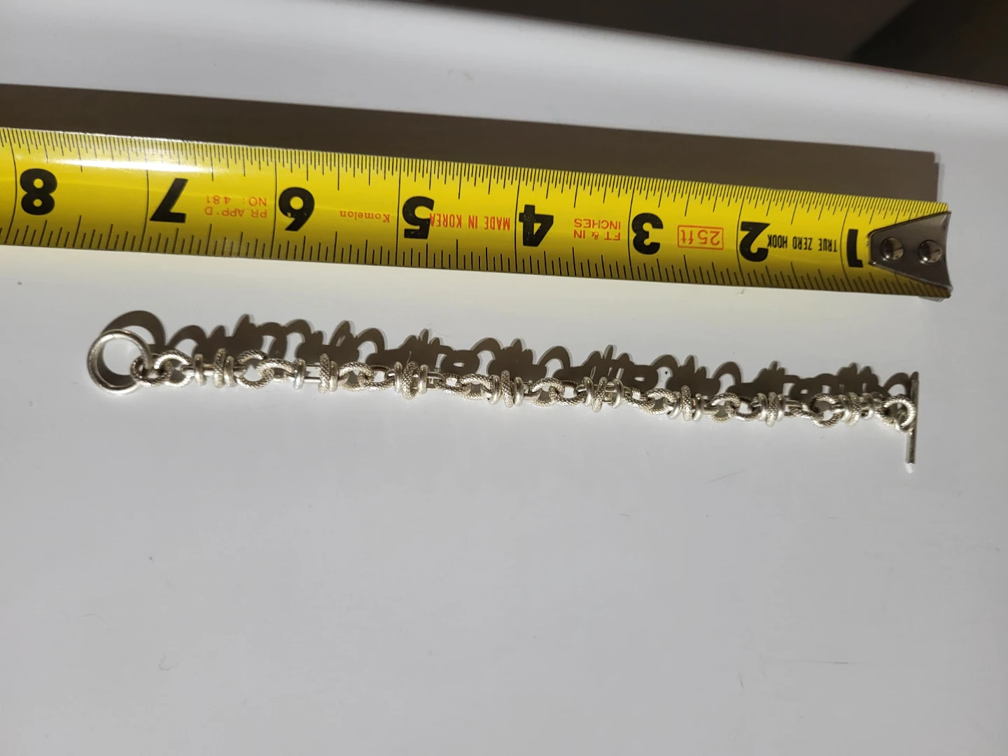 This sterling silver bracelet features a unique knotted chain design. It's secured with a toggle clasp. It measures approximately 7 inches in length.