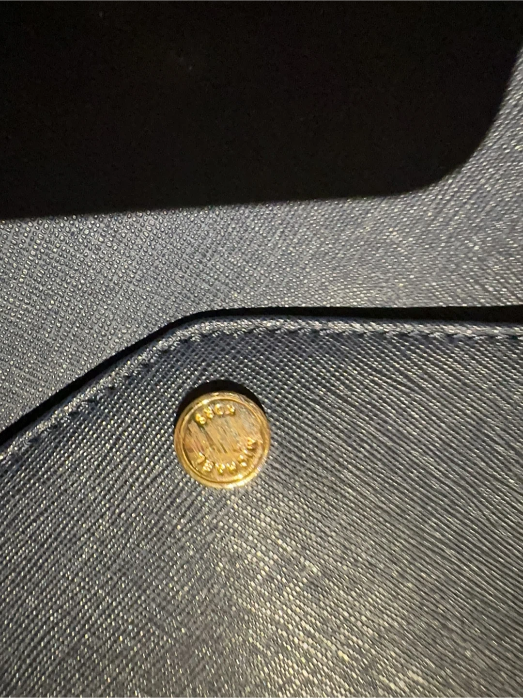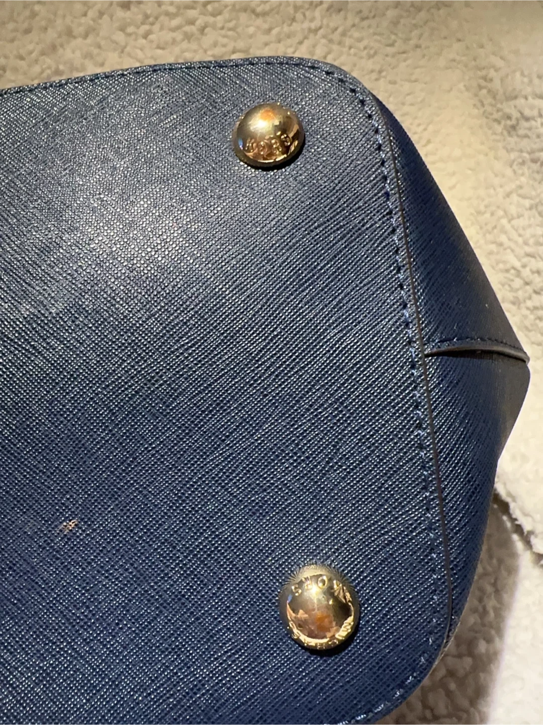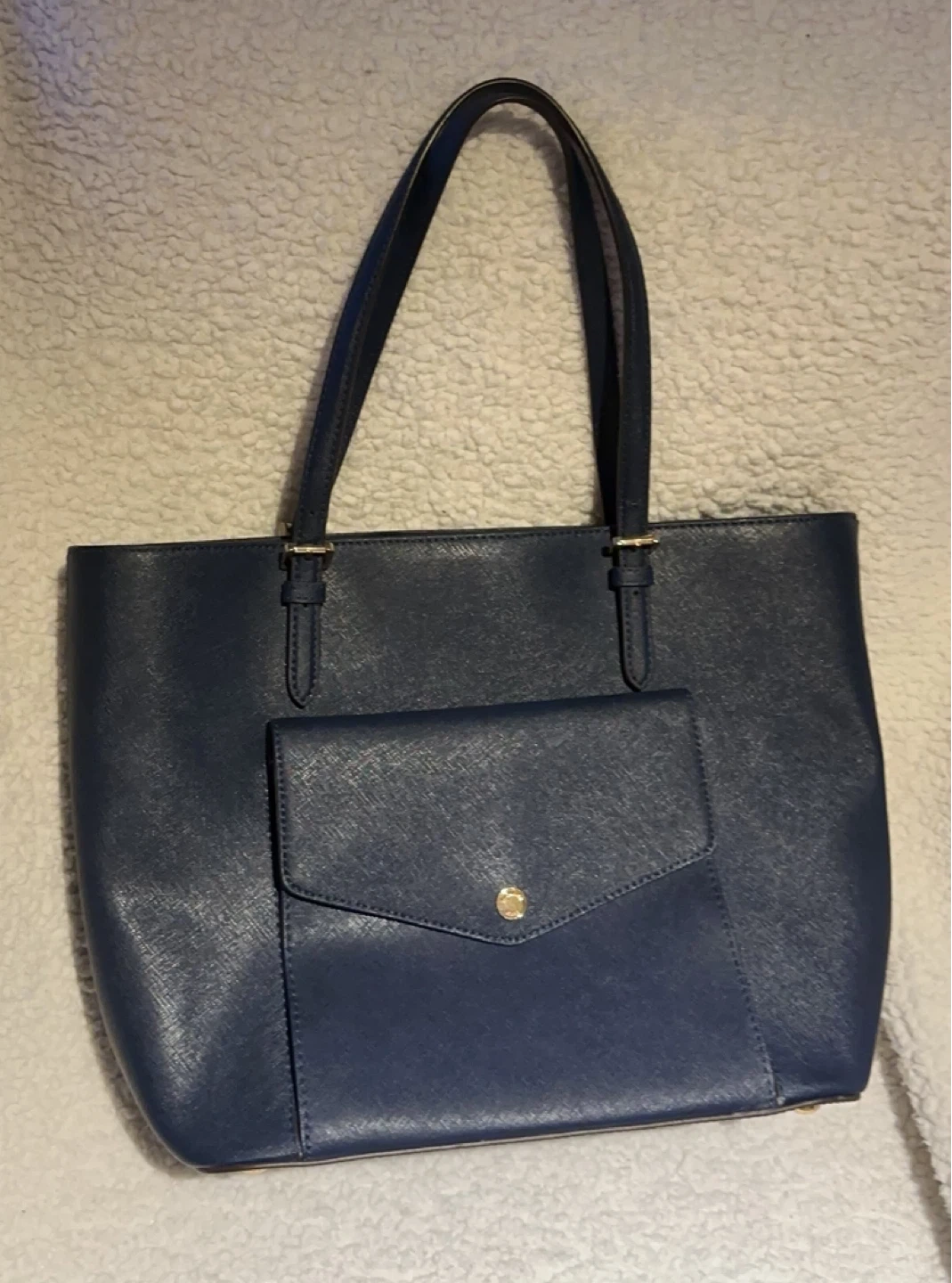Michael Kors navy blue tote bag. Saffiano leather exterior with gold-tone hardware. Features a front flap pocket and spacious interior with multiple compartments. Classic everyday tote! New with tag, but with some scratches showing on the pictures.