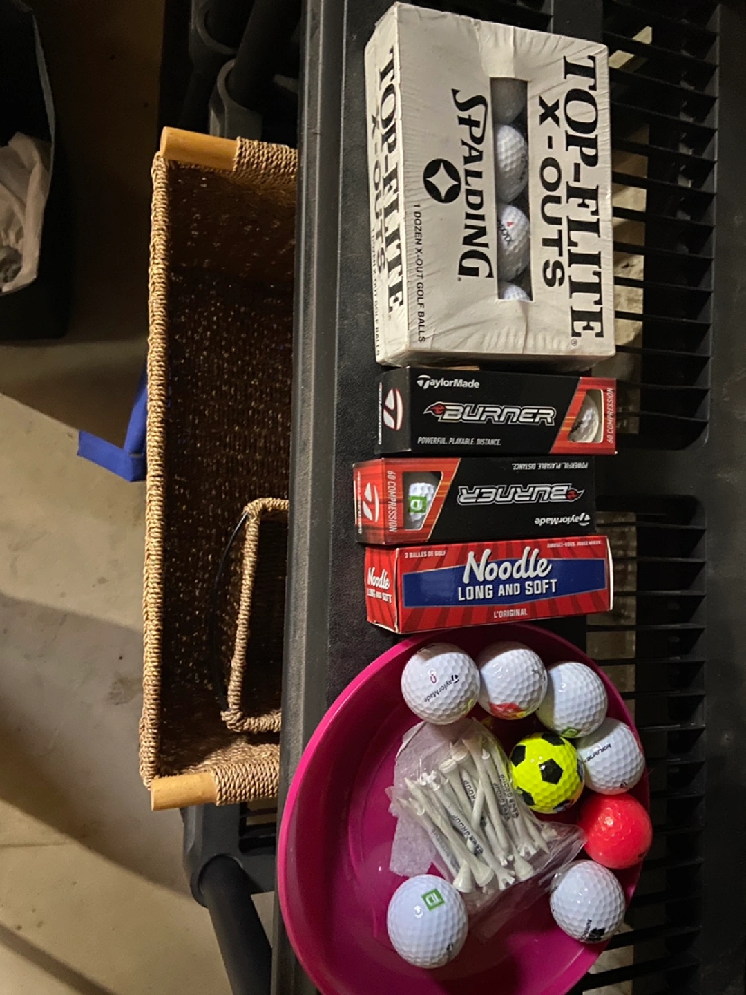 Pre-owned Callaway RAZR FIT 11.5 driver. Includes various golf balls – Top-Flite, Spalding X-Outs, TaylorMade Burner, Noodle – and a selection of tees. Great for the course or practice.