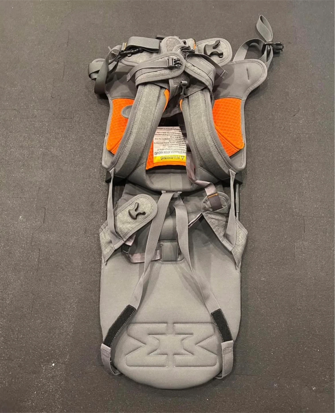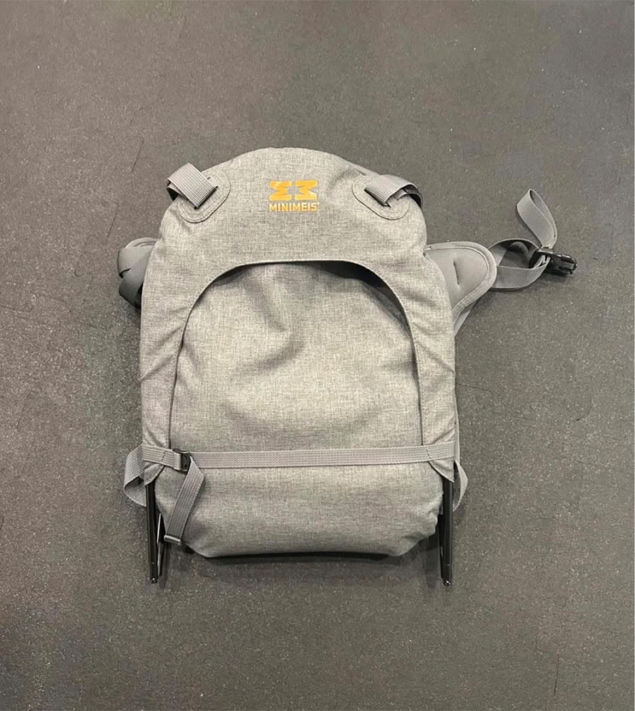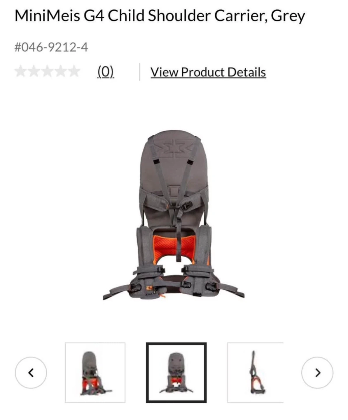 This is a MiniMeis G4 child shoulder carrier in grey. It's designed for hands-free carrying of your child. The carrier features adjustable straps and padded shoulder rests.