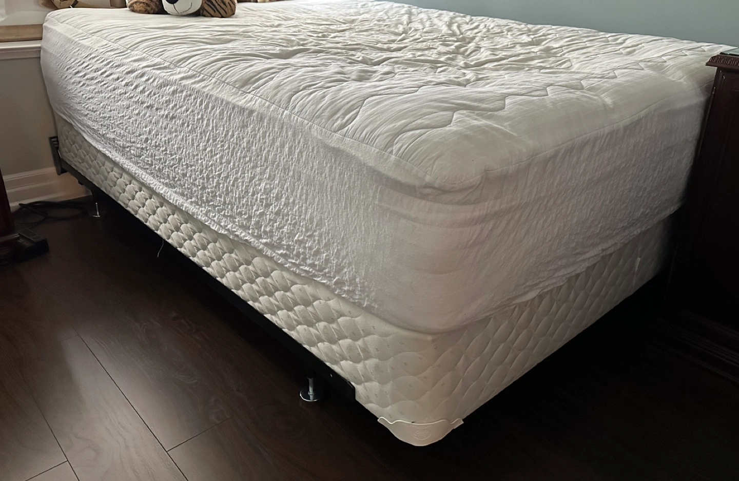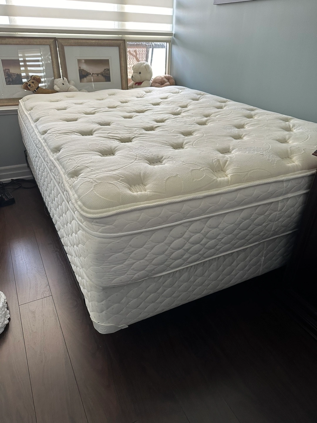 Queen mattress and box spring set. White fabric. Used but in good condition. Pick up only.