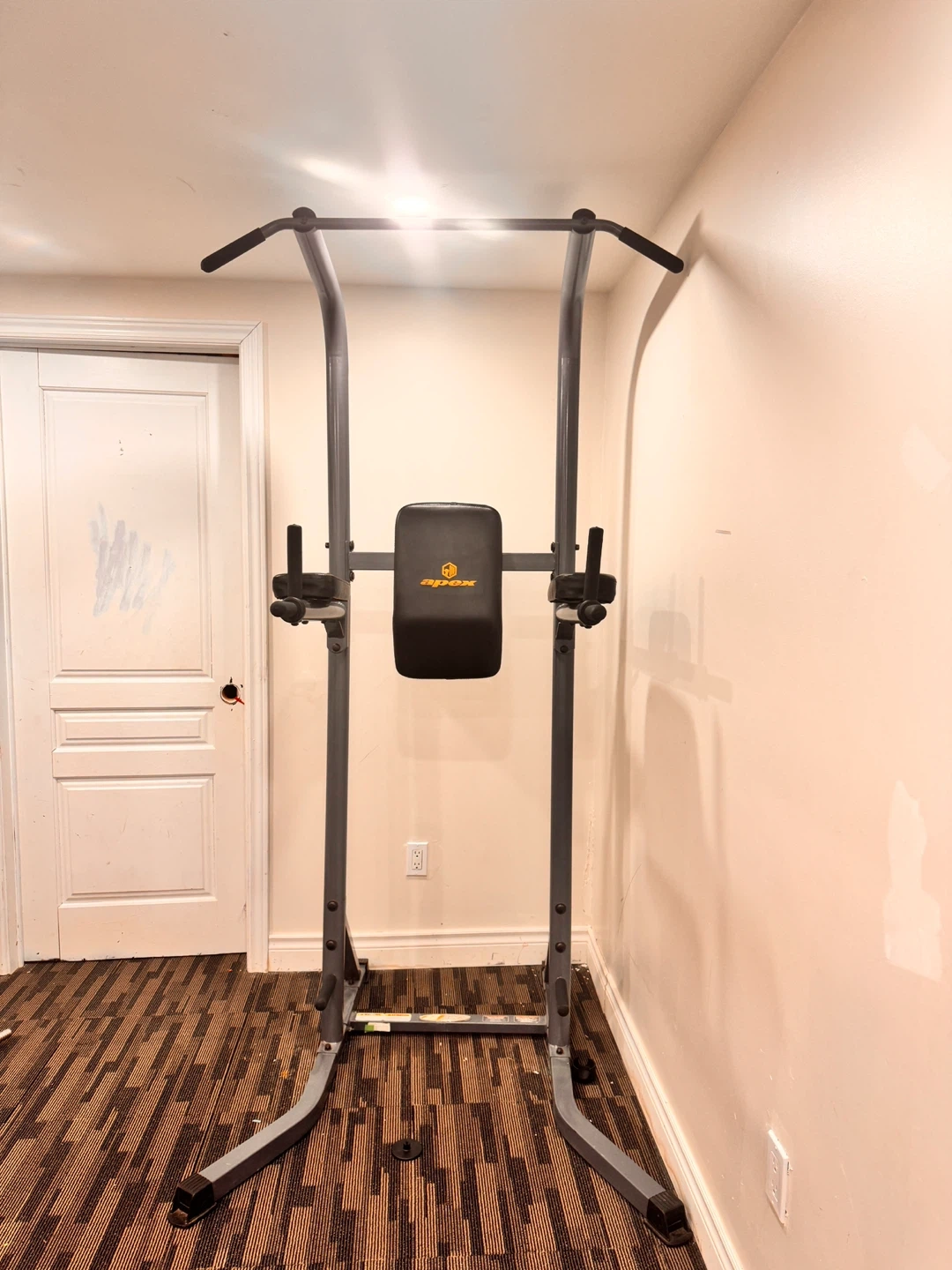 This Apex power tower offers a versatile workout station. It has a pull-up bar, dip station, and leg raise supports. Constructed with a sturdy steel frame for stability.