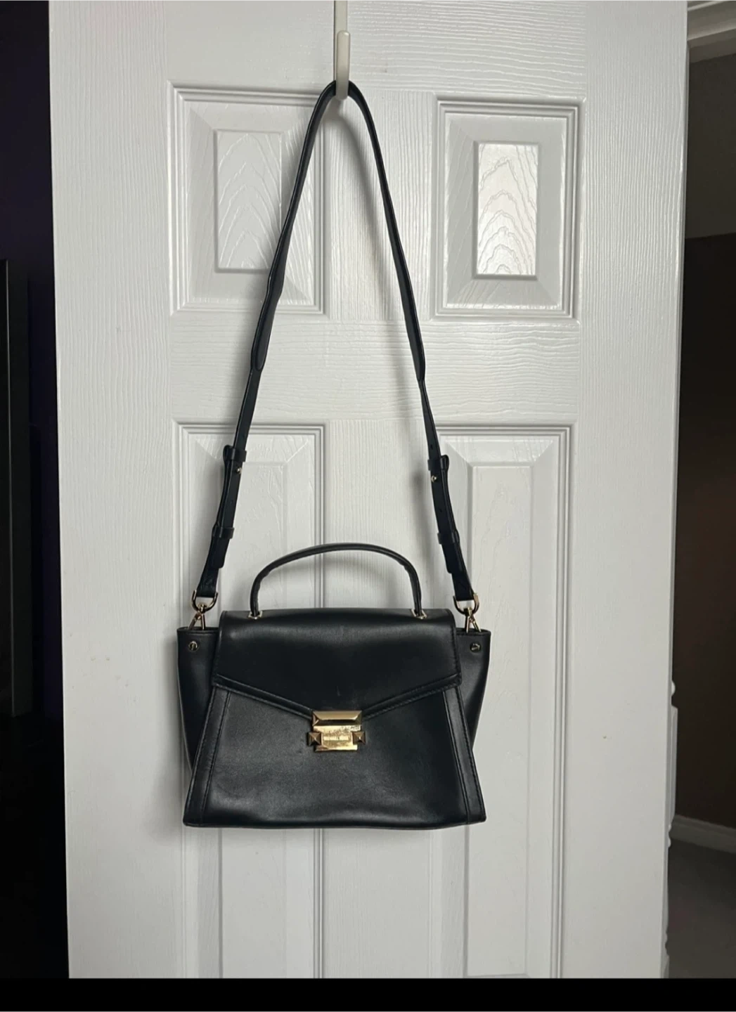 This is a Michael Kors black leather satchel handbag. It's made from genuine leather with gold-tone hardware. This bag can be carried by the top handles or with the adjustable shoulder strap.