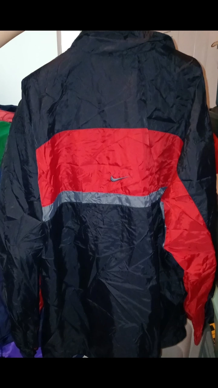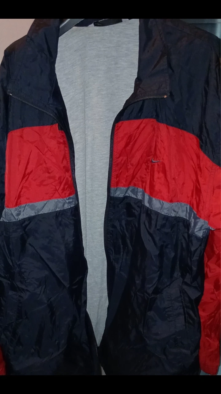 Classic Nike windbreaker in navy blue, red, and grey. Lightweight nylon shell. Full zip front with pockets. Good for outdoor activities!