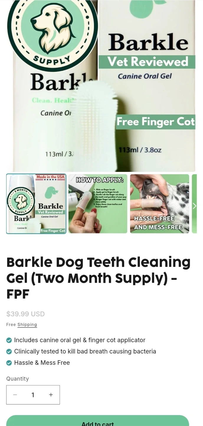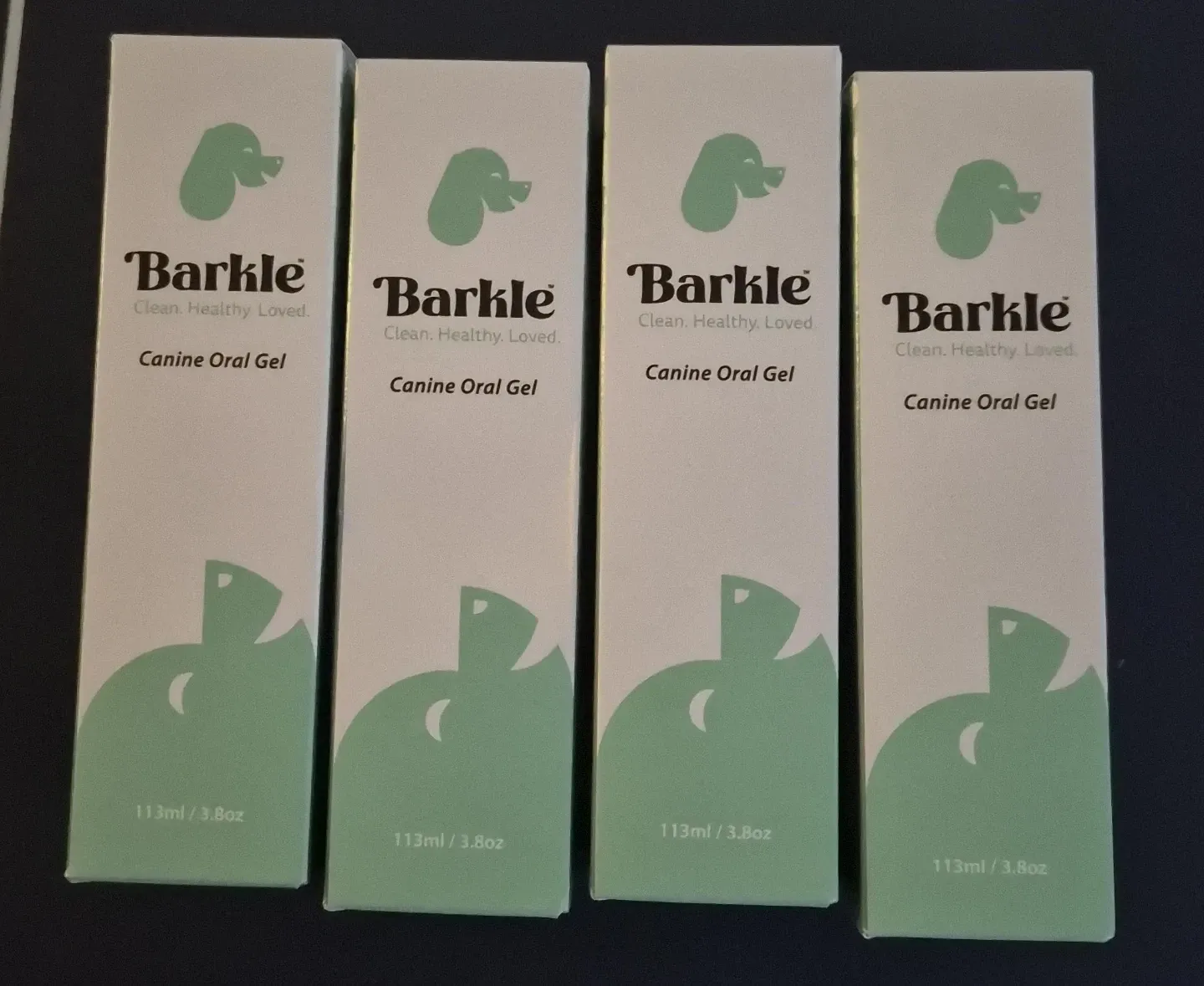 Barkle Canine Oral Gel for dogs. Vet Reviewed and Made in the USA. Includes canine oral gel and a free finger cot applicator. Clinically tested to kill bad breath causing bacteria. Hassle and mess-free application! $15 for 1 $40 for 4