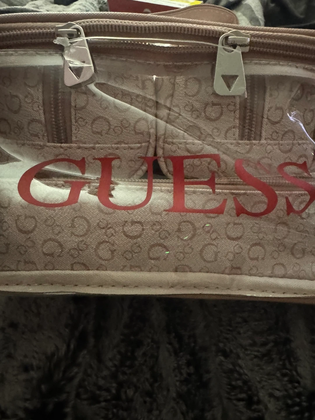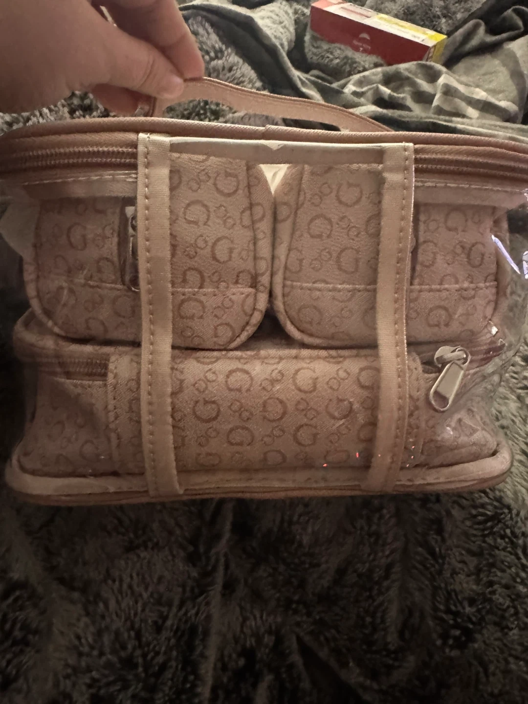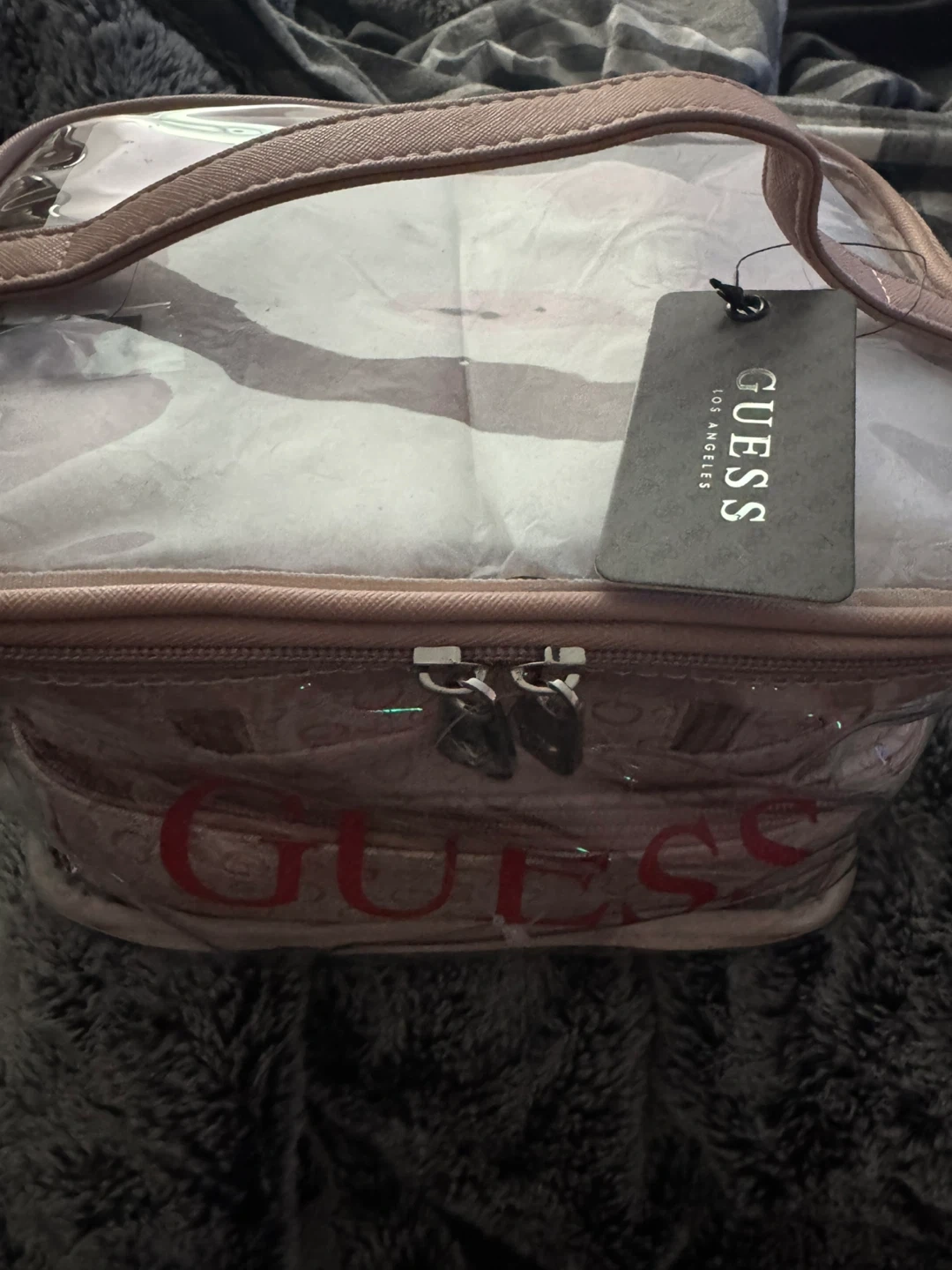 Selling a Guess clear cosmetic travel bag! It features a pink trim and the Guess logo printed on the front. Perfect for organizing your makeup and toiletries! Never open✅
